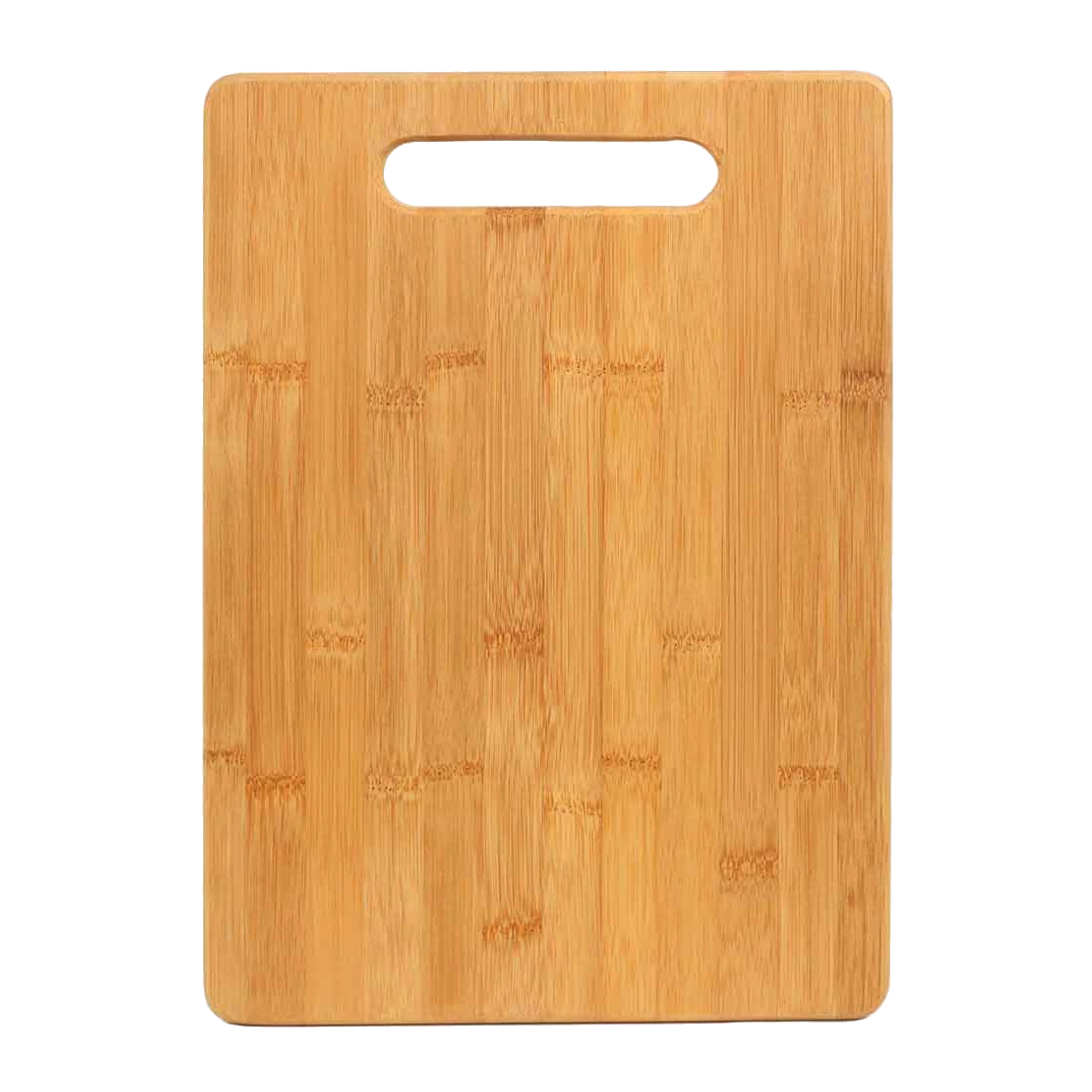 Beautifully crafted 13 3/4" x 9 3/4" rectangle shaped bamboo cutting board with handle.