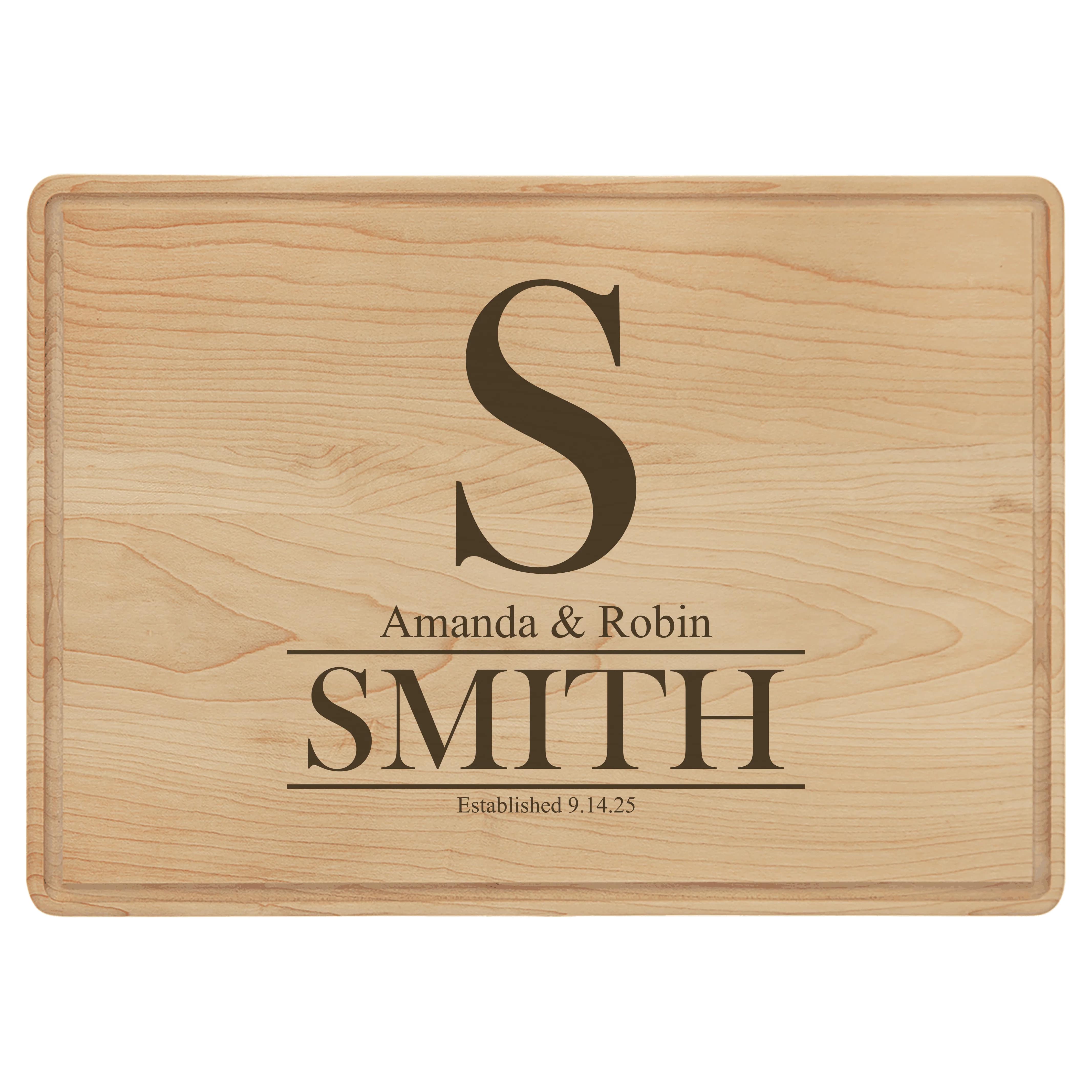 This beautiful maple cutting board has a drip ring all around the top to help prevent messes. Cutout handles on bottom of board leave a solid, no hole surface at the top. Personalized, this cutting board is a perfect gift for any occasion.