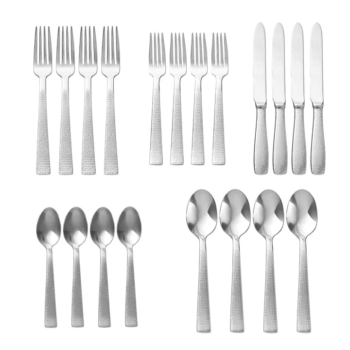 Infuse your table with the perfect blend of bold modernity and timeless elegance with Ricci Silversmiths' Martello Mirror 20 piece flatware set. The sleek, hammered-finish handles, with their reflective shine and squared-off ends, bring a striking visual appeal, while the heavy gauge 18/10 stainless steel offers durability that lasts a lifetime.