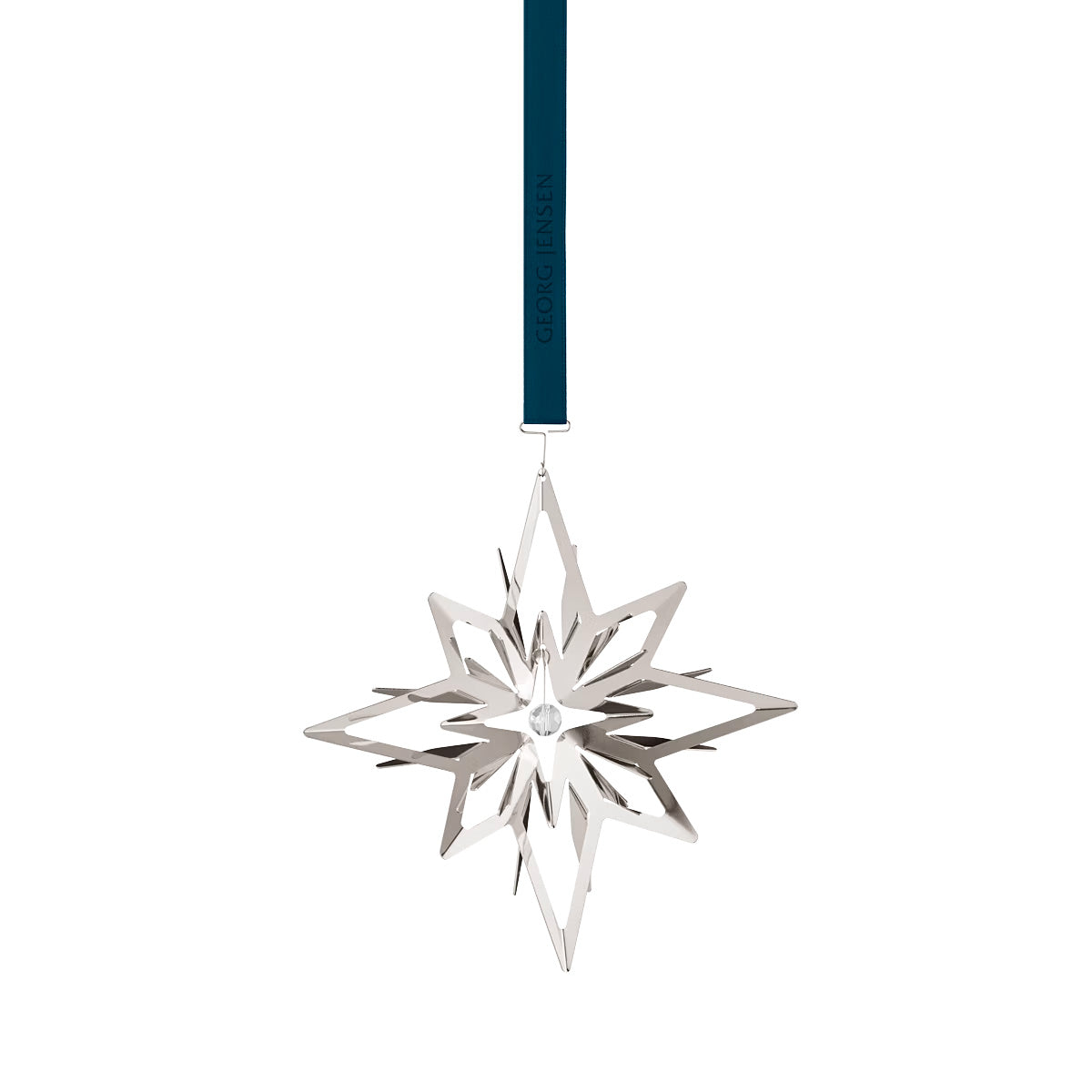 The 2024 edition of the annual Georg Jensen Christmas Mobile features a radiant star designed by long-time collaborator Sanne Lund Traberg. The pendant hangs from a festive red ribbon and features a small zirconia ball at its centre for an extra touch of sparkle. Its silver, palladium-plated form is inspired by the shimmering quilt of stars that light up the night sky on a dark, wintry evening.