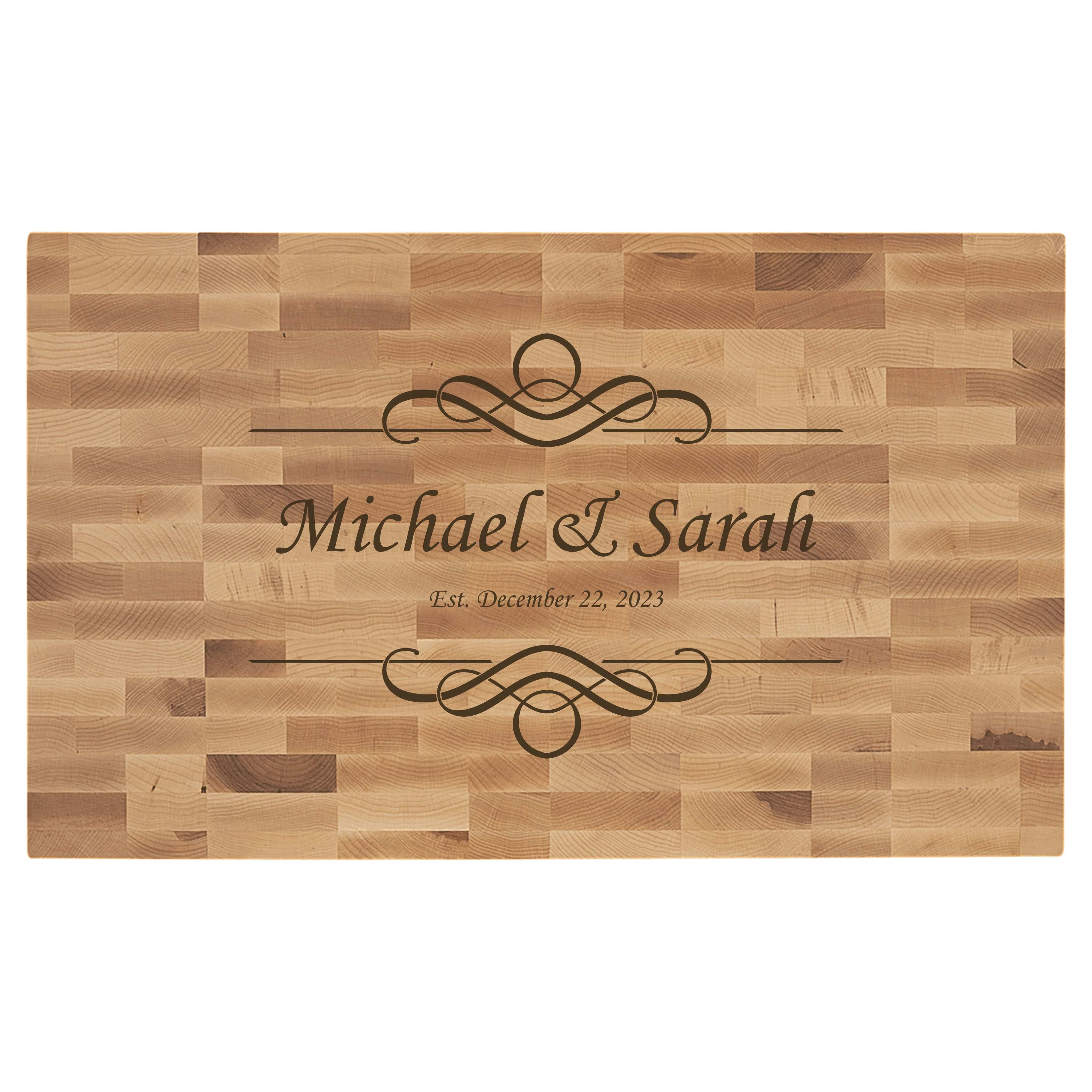 This large genuine maple cutting board is a full 1 1/2" thick and features a beautiful butcher block top. The huge personalization area makes it perfect to create unique signage and custom wall decor, or an heirloom quality personalized gift to be treasured for years to come. This cutting board would also make a stunning award for any cooking competition!