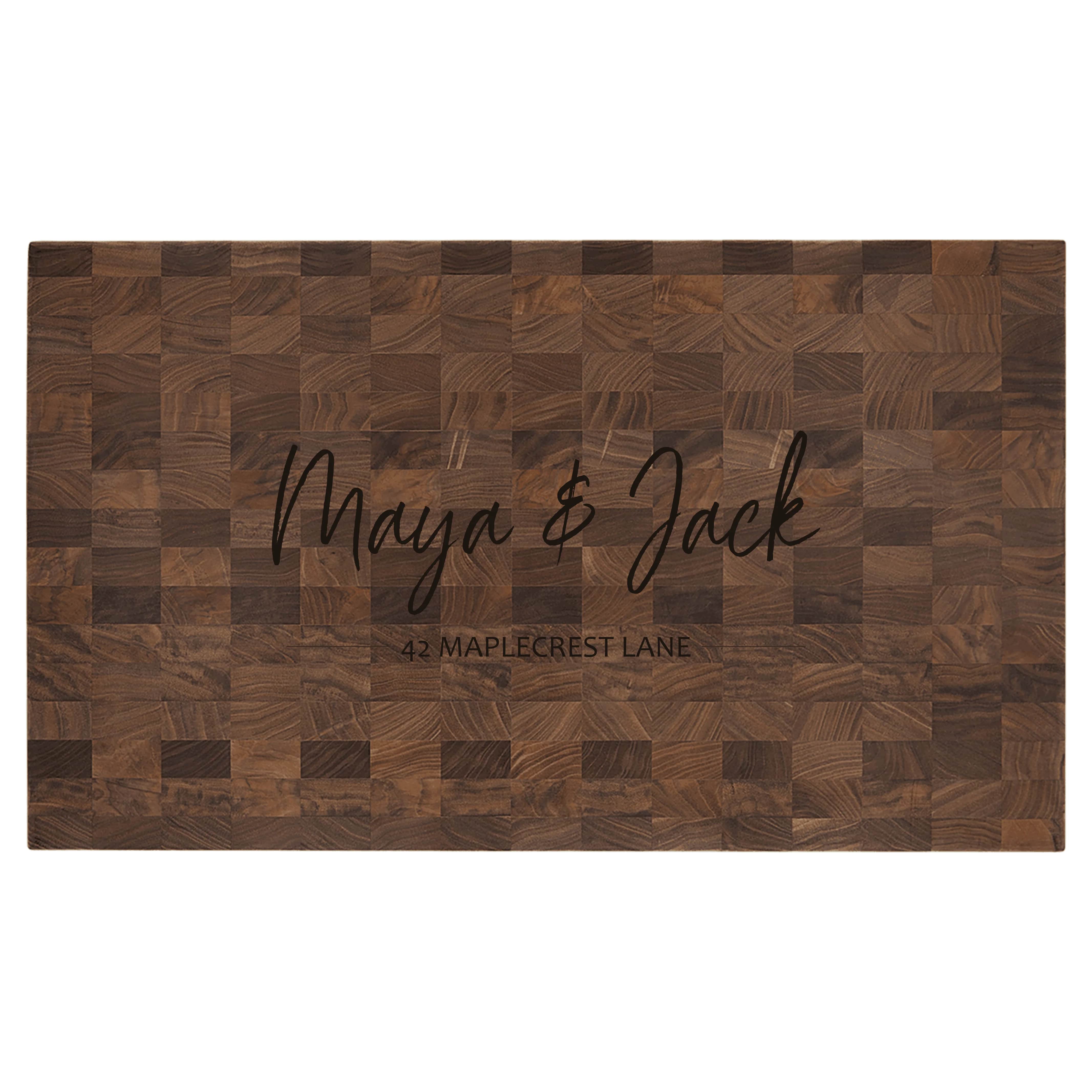 This large genuine walnut cutting board is a full 1 3/8" thick and featuresa beautiful butcher block top. The huge personalization area makes it perfect to create unique signage and custom wall decor, or an heirloom quality personalized gift to be treasured for years to come. This cutting board would also make a stunning award for any cooking competition.