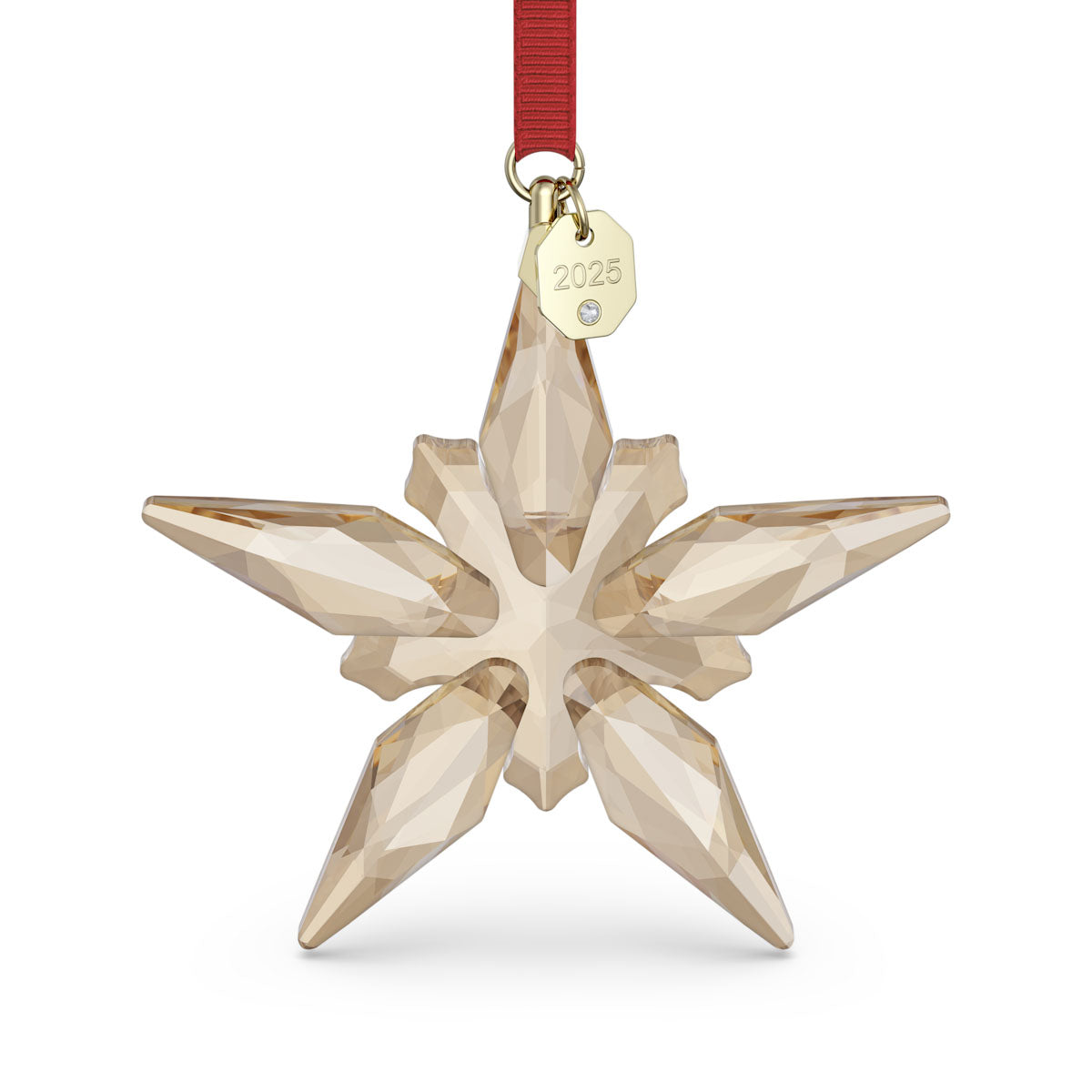 Embrace one of the traditional highlights of the season with this Swarovski Annual Edition Ornament. Suspended from a red grosgrain ribbon with champagne gold-tone accents, the star-shaped design is precisely cut with 190 light-catching facets, beautifully embodying Swarovski’s complex simplicity and technical skill. The gold-tone colored design is completed with a 2025 engraving on the tag. Perfect for hanging on a decorative tree, in a window, or around the home, this ornament is a truly wondrous way to highlight your holiday celebrations. Decoration object. Not a toy. Not suitable for children under 15.