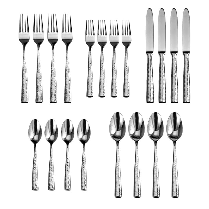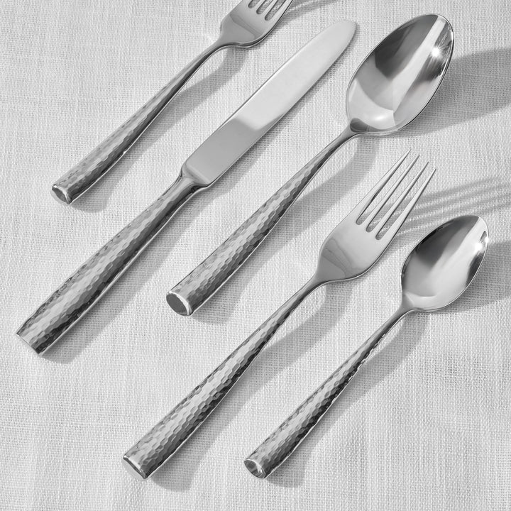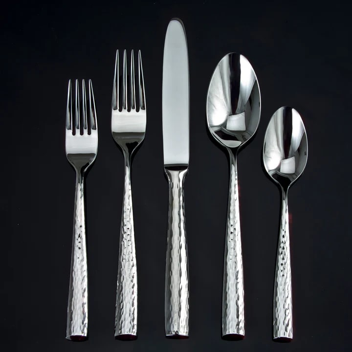 Crafted with a hammered handle and a polished mirrored finish, this flatware set strikes the perfect balance between skillful artistry and sophisticated elegance. A culinary masterpiece of art and design, each piece in this flatware set is carefully hand-crafted with a hammered handle and finished with a dazzling mirrored polish. Every meal becomes a sophisticated affair with these premium utensils, elevating your dining experience to new levels of refined elegance.