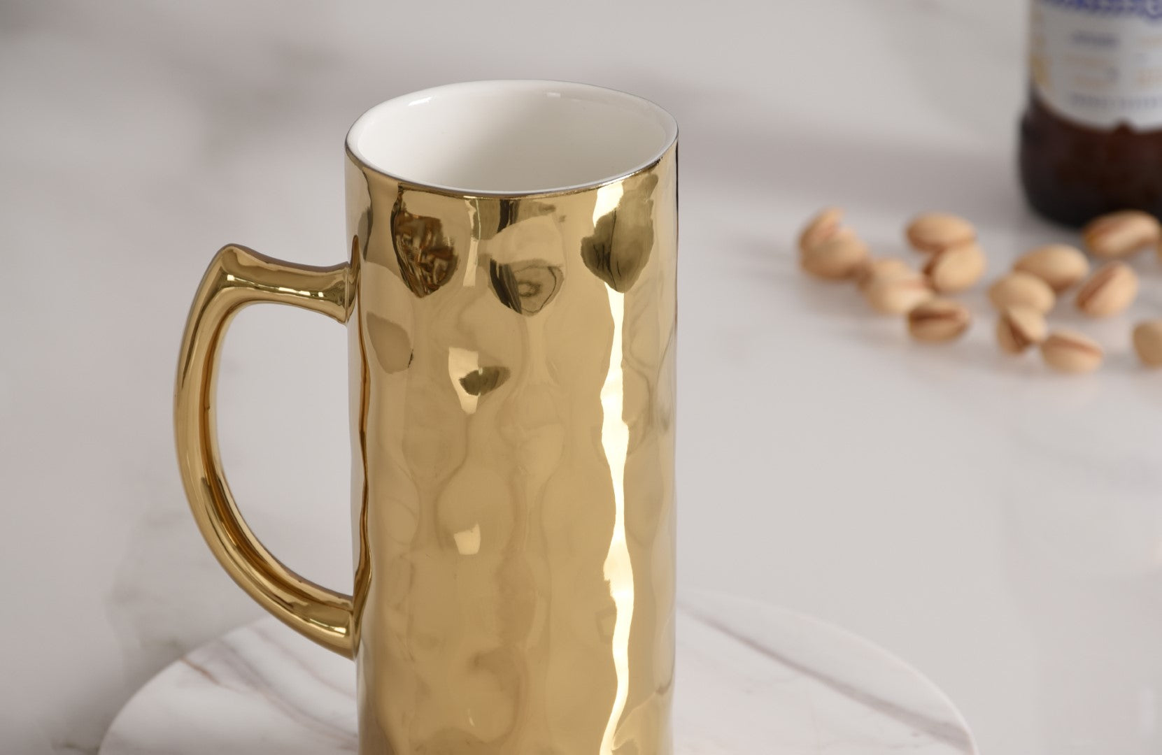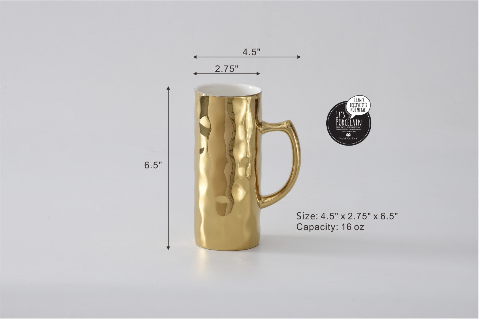 Happy hour just got even happier. Enjoy a cold beer in this stunning textured Beer Mug from our Accessories collection. Handcrafted in striking high-fired white porcelain combine with an elegant metallic gold finished outside. Freezer Safe. Food safe. Dishwasher safe. Easy Care. Capacity: 16 oz