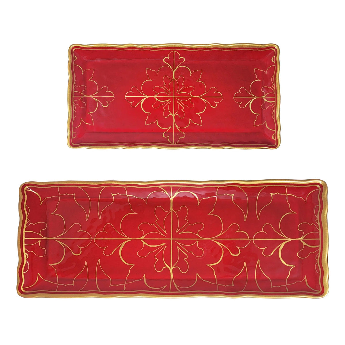 We've taken two of our most popular side serving pieces, our Garnet Biscuit and Baguette Trays and gift wrapped them with ribbon to make your gift giving effortless. Pairs back with all dinnerware and serving pieces in our Garnet and Vischio holiday collections. BPA Free 100% melamine, shatter-resistant and dishwasher safe, top and bottom rack, as with all melamine, not recommended for microwave. Product includes one Biscuit Tray with dimensions 10” by 5” and one Baguette Tray with dimensions 15” by 5.75”.