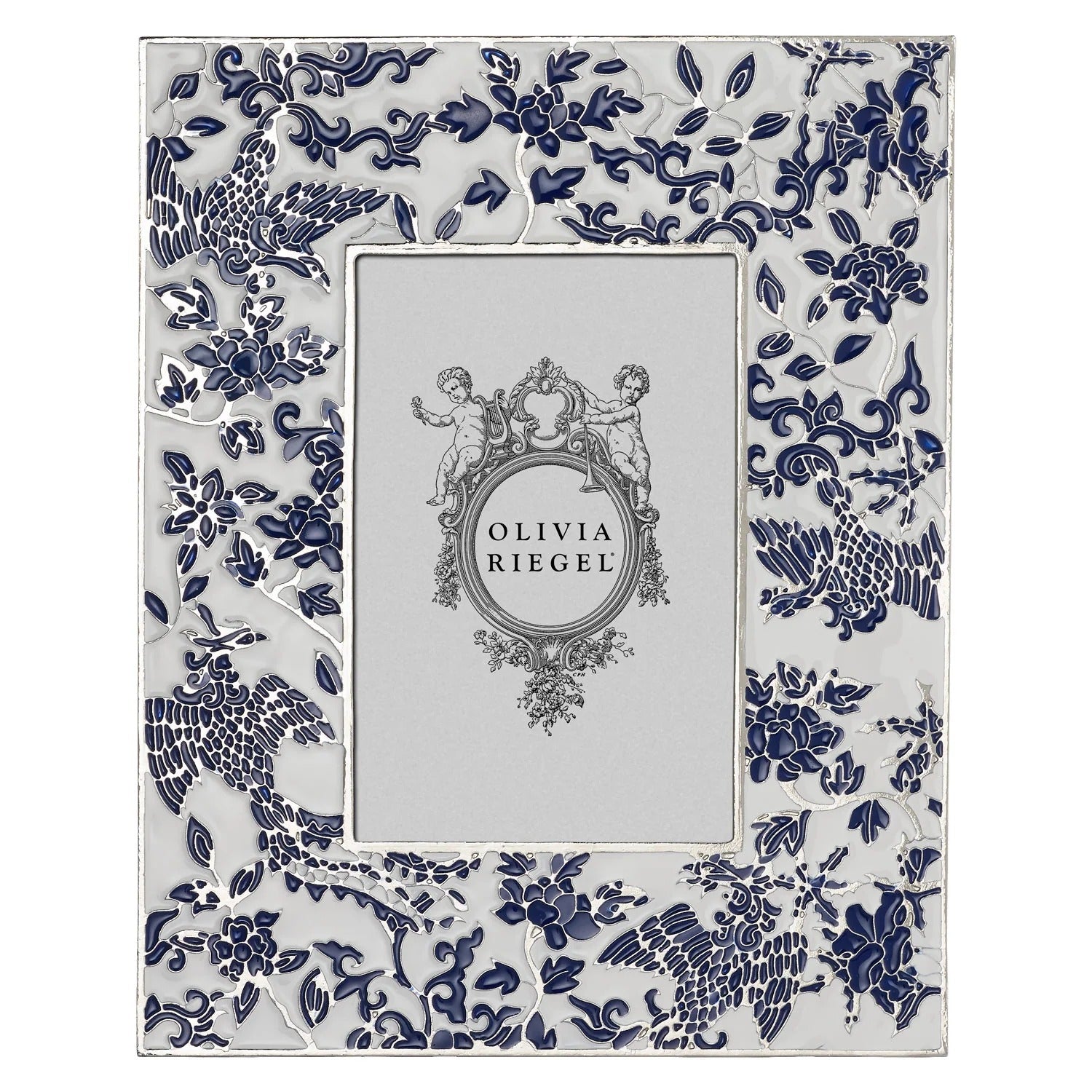 Celebrating a mythical creature, long associated with nobility and transformation. Silver finished pewter chinoiserie pattern, with intricate hand-enameling in blue and white hues. Beveled glass. Elegant gray moiré silk back, with easel designed for vertical or horizontal placement. Tarnish resistant. Signature luxury gift box included.