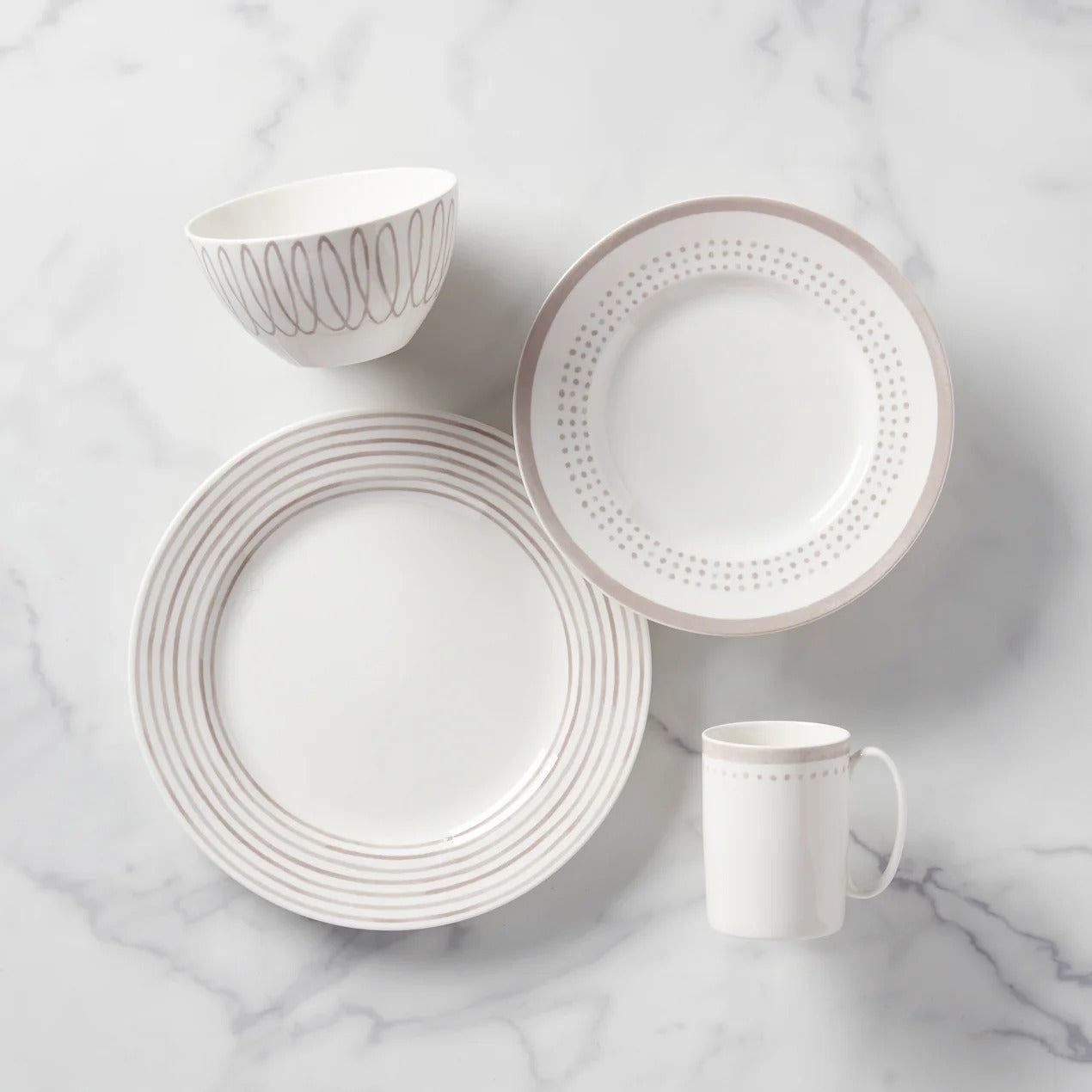 Because every meal - whether it is a multi-course homemade masterpiece or Chinese takeout and cupcakes - deserves a perfectly pretty place setting. Like this 4-piece place setting from the Charlotte Street Grey East Collection, crafted of microwave and dishwasher-safe durable white ceramic porcelain. Bon appetit!