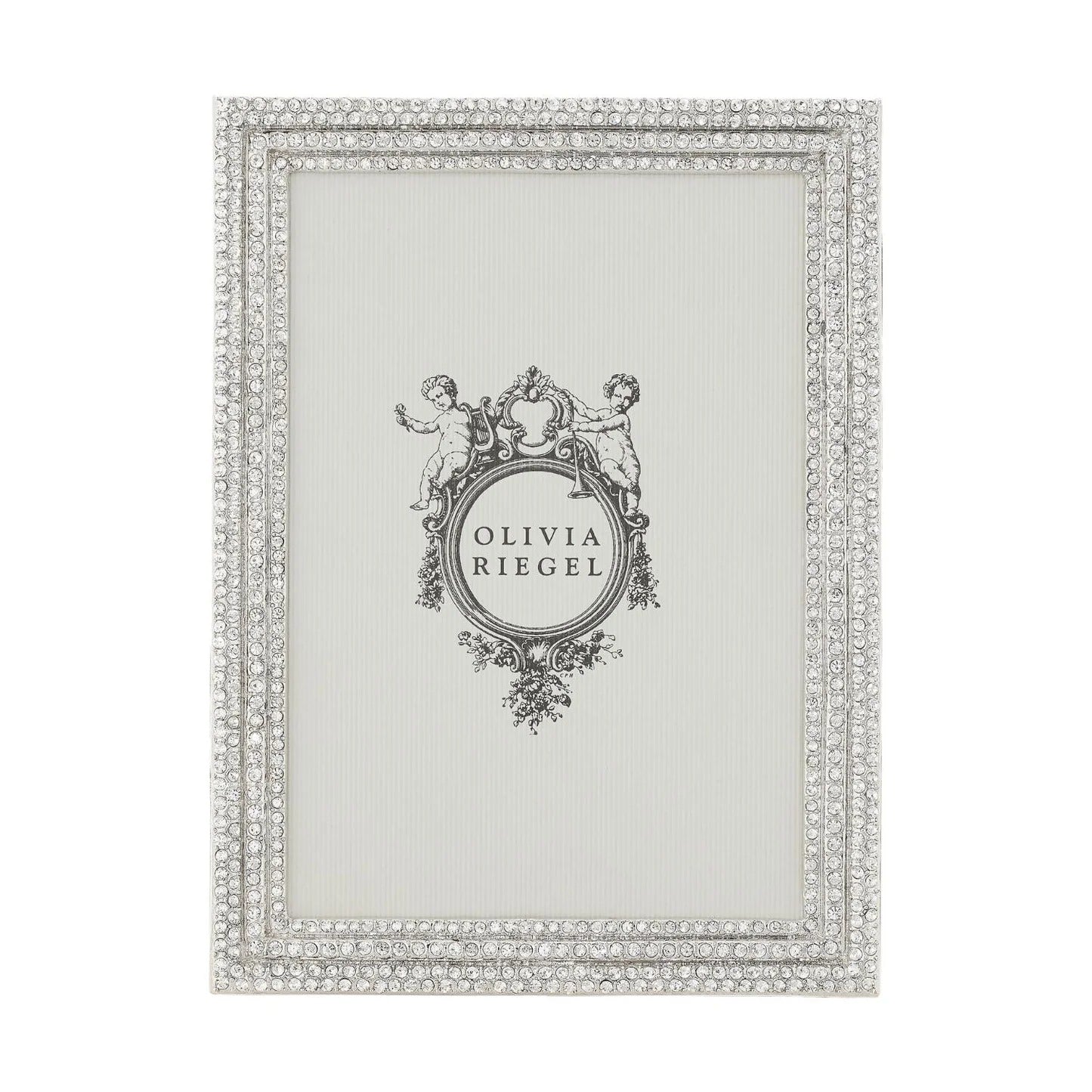 Silver finished pewter, heavily encrusted with rows of hand-set clear European crystal pavé. Beveled glass. Elegant gray moiré silk back, with easel for horizontal or vertical placement. Tarnish resistant. Signature luxury gift box included.