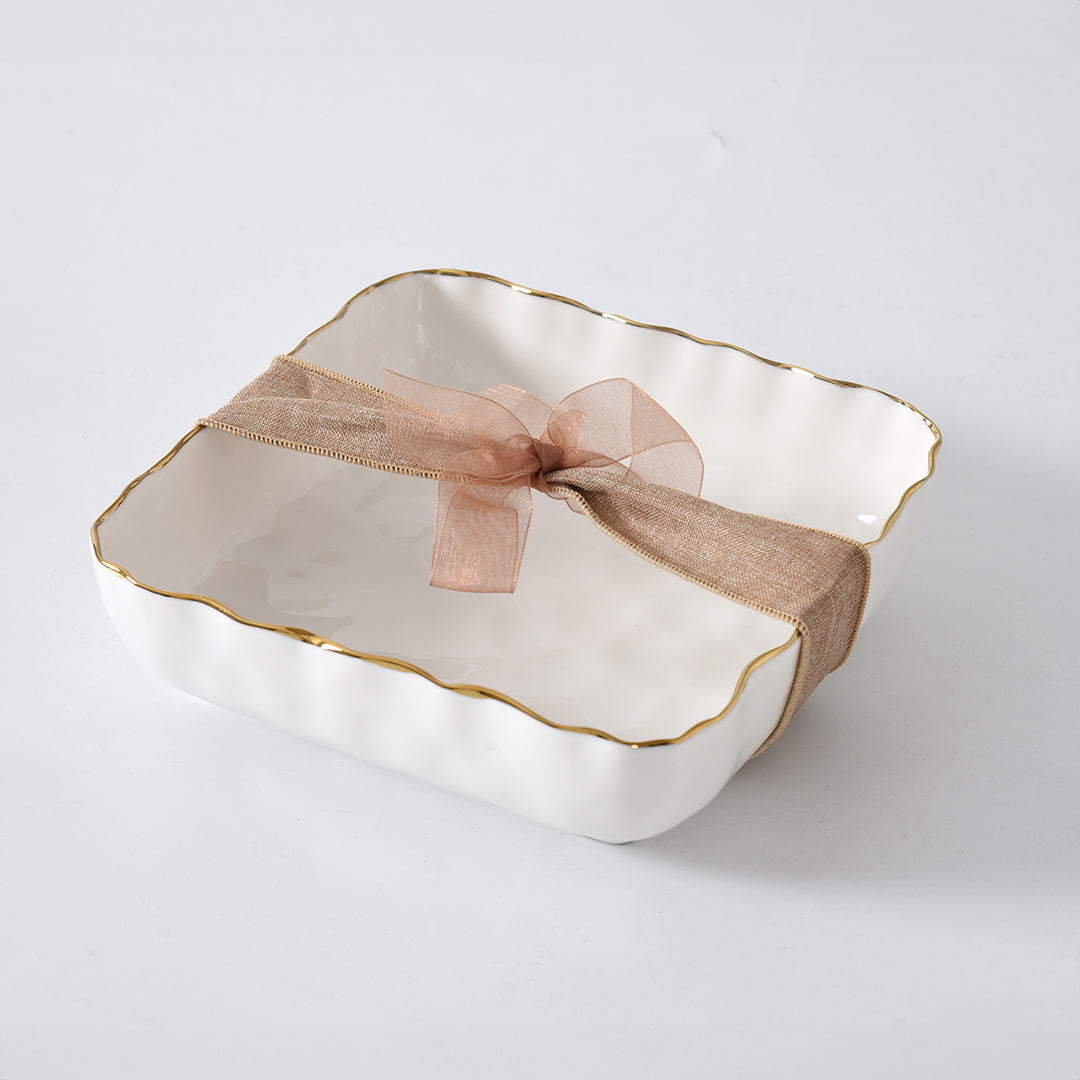Cocktail Napkin Holder from our Portofino collection. Add a touch of luxury and elegance with this magnificent napkin holder. Also great for serving up small pastries, sliced fruit and appetizers. Gorgeous white porcelain with a delicate gold trim. Food safe, dishwasher safe, oven safe to 500°. Tarnish and stain-free. Easy Care.