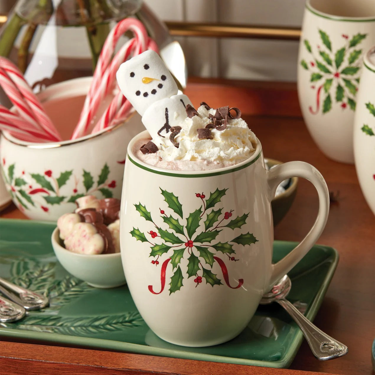 New from our bestselling Holiday collection, this cocoa mug features our signature holly motif with a green trim around the rim. It makes a great stocking stuffer or as a gift for yourself when you're warming up for winter!