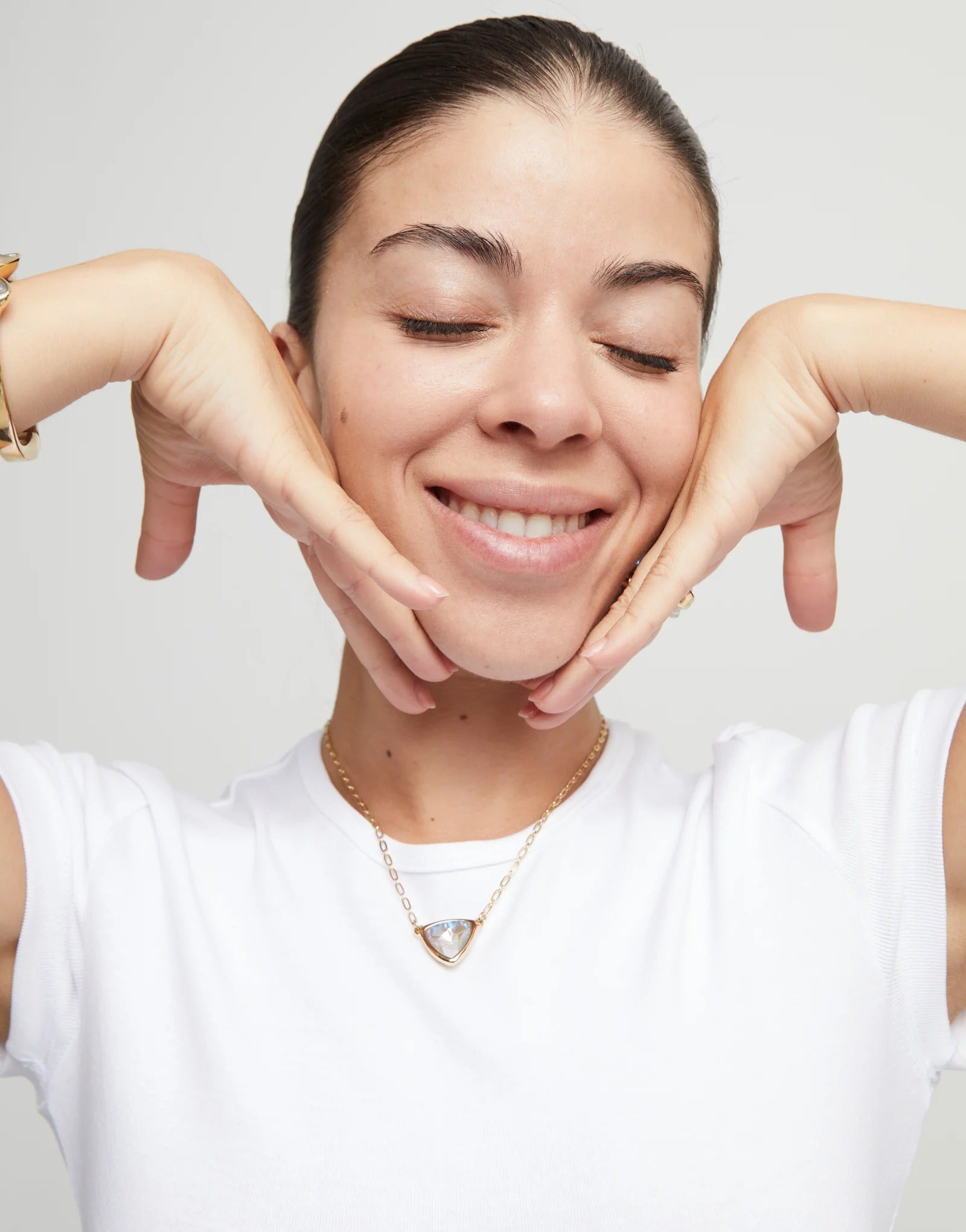 18k gold-plated link pendant with central triangle and multicolor crystal.Ser camaleónica is to adapt to everything with talent, while still being you. Is being versatile, resilient and always ready to reinvent yourself. Let your jewelry become a kaleidoscopic and change color. Nobody gets bored with you. Bring fun and dynamism to life. Like the fresh touch of the faceted crystal pieces that play with dimensions. The time to Ser camaleónica is now.