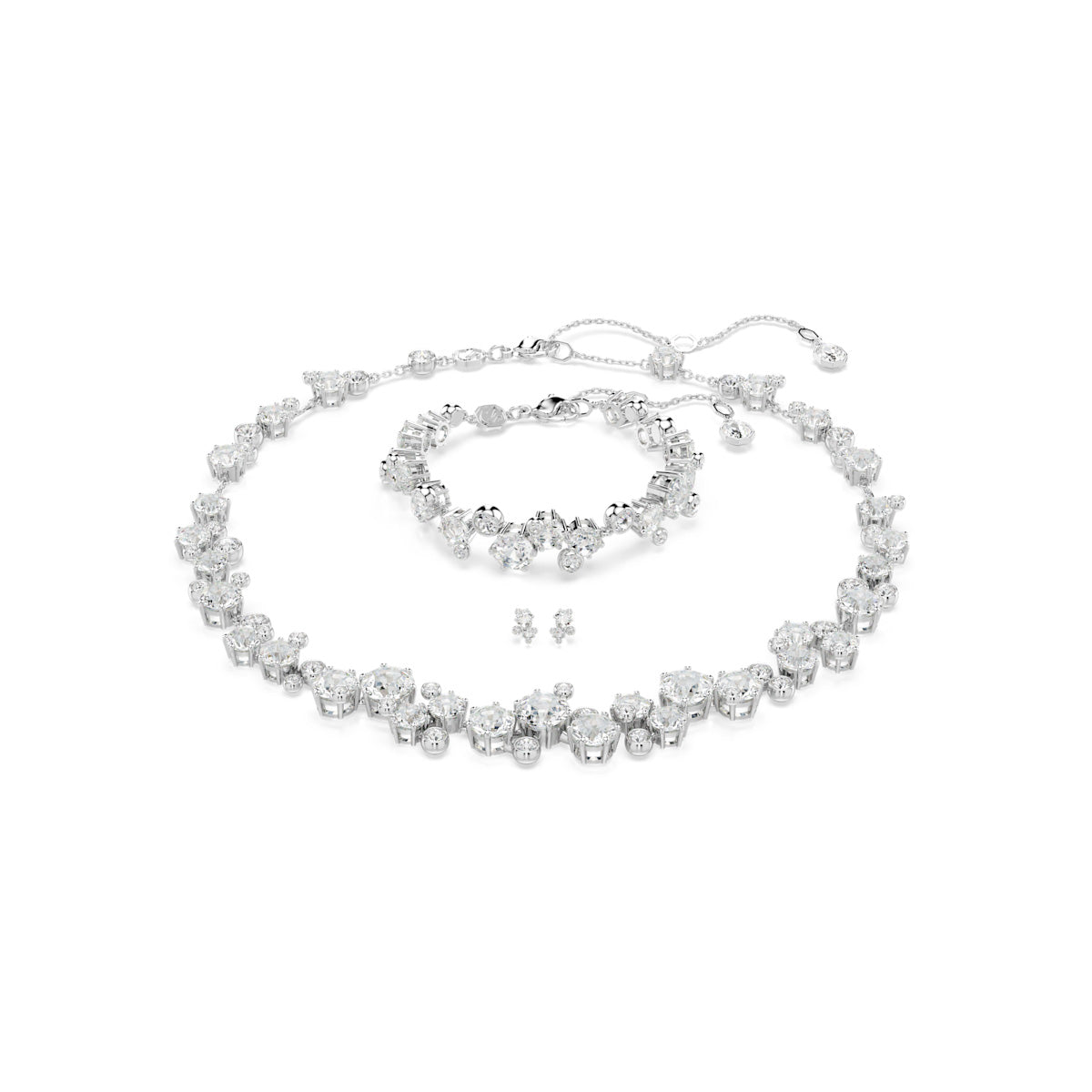 Let your style shine brighter with the matching necklace, bracelet, and studs in this starry Constella set. Each of the three rhodium plated pieces showcases clear crystals in various sizes, displayed in a prong or bezel setting. The necklace and bracelet also include octagonal stations for an easy size adjustment. It’s a cluster of light that adds pure radiance to any look.