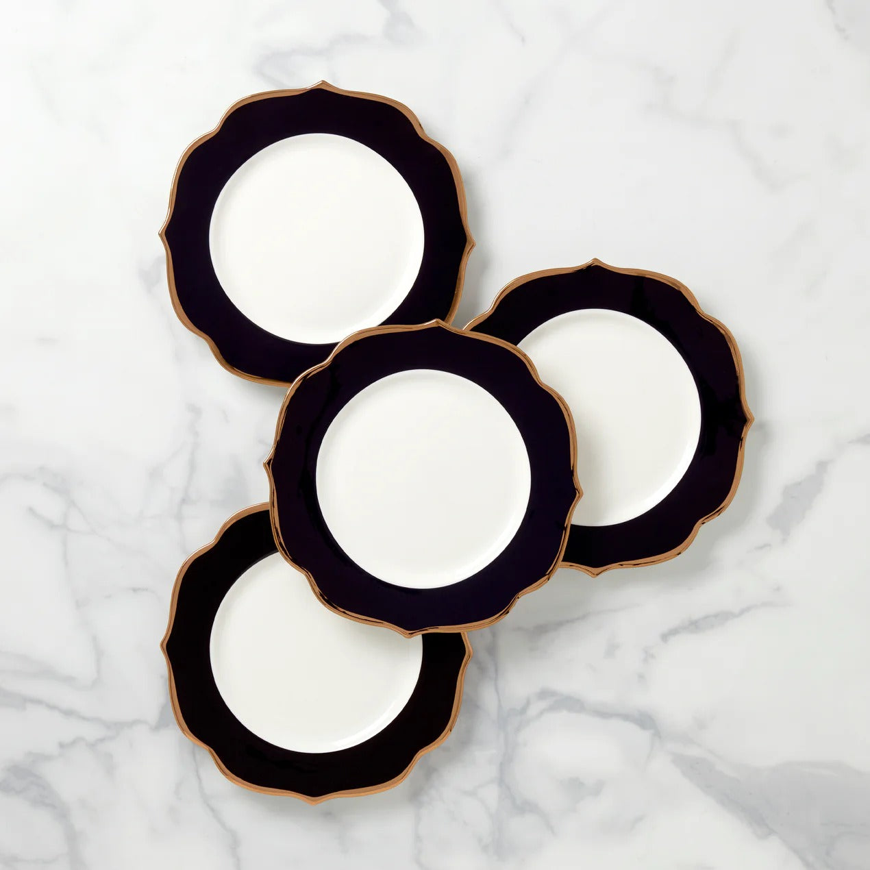 Crafted of durable porcelain, Contempo Luxe Black Accent Plates are ideal for side salads or sandwiches. These plates feature a sleek black color profile, with innovative microwave-safe gold accents encompassing its scalloped rims. These dishwasher-safe plates function well with formal and casual dinnerware.