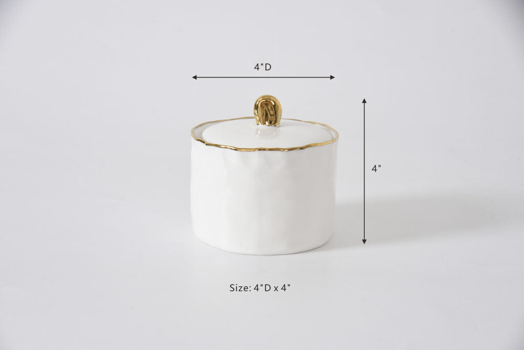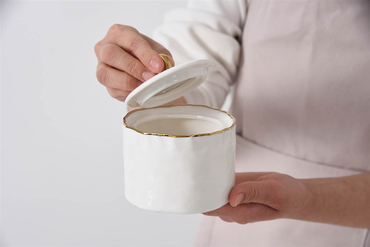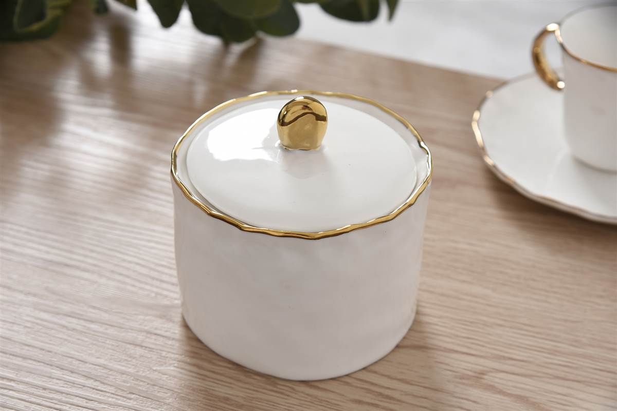Covered Sugar Bowl from the Portofino Collection. The perfect everyday sugar bowl is designed for relaxed meals with friends and family. Works equally well with jam, honey, mustard, and other condiments. Or keep this gorgeous bowl on your shelf, vanity, or bathroom counter to hold everything from cotton balls to earrings! Beautifully crafted white porcelain with a delicate gold trim. Food safe, tarnish free, dishwasher safe, oven safe to 500°F.