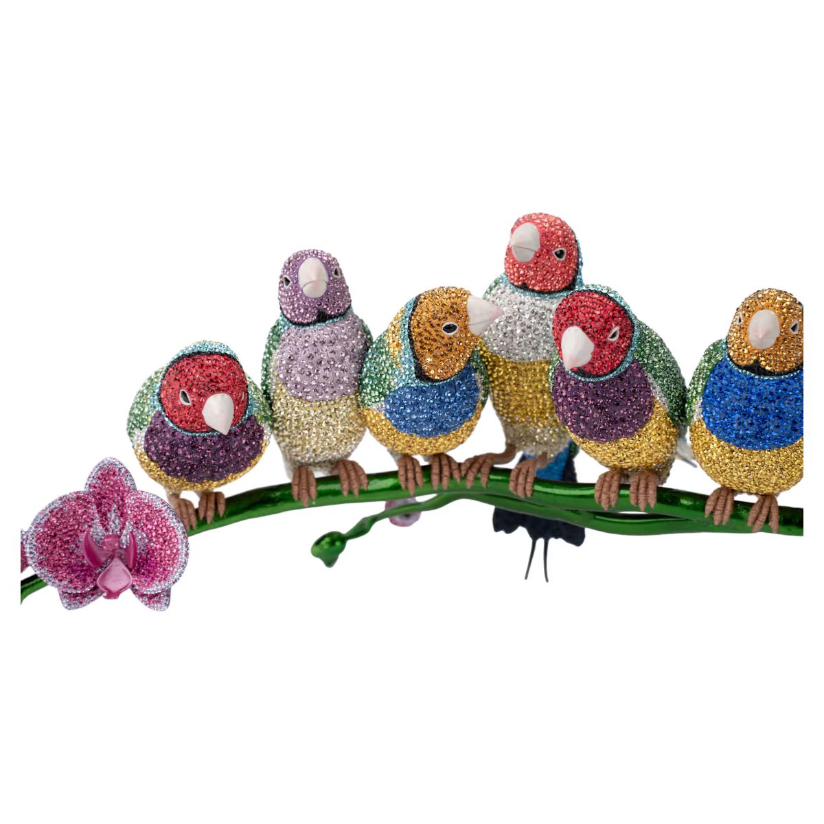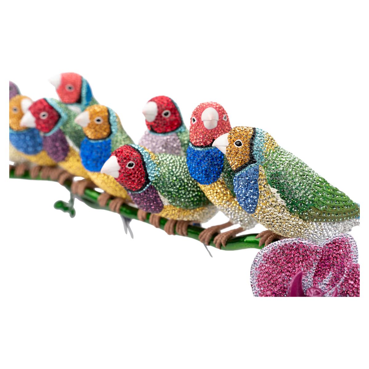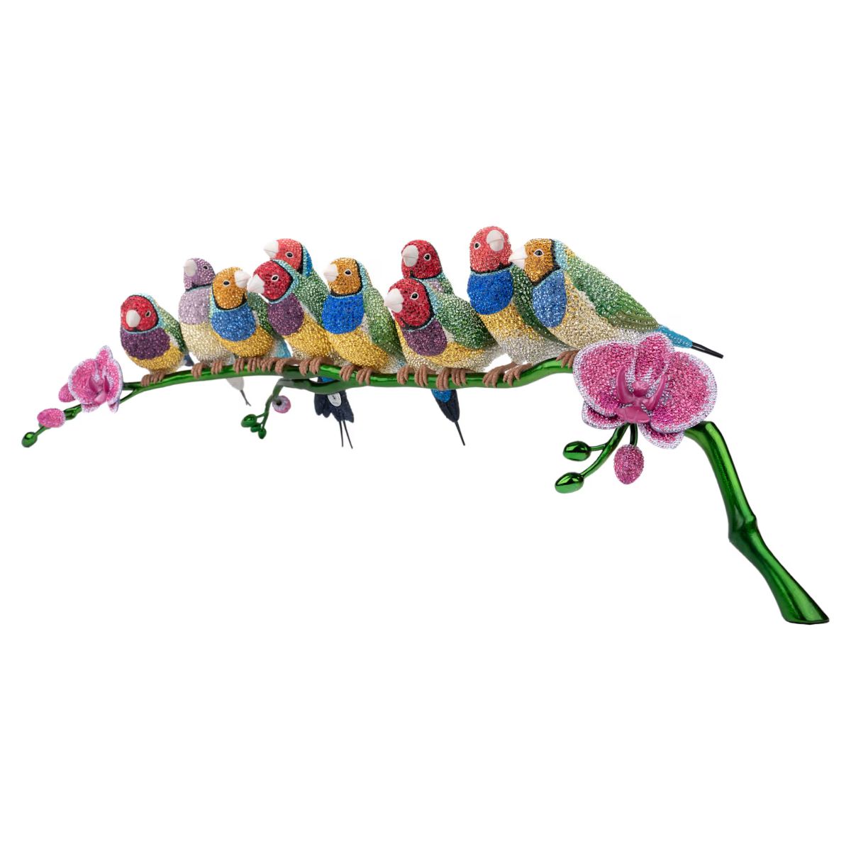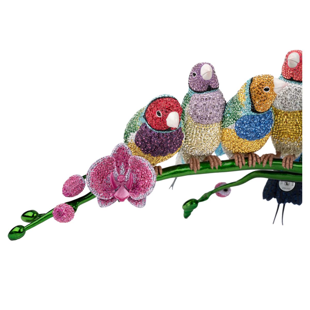 With extraordinary color and exquisite detailing, Swarovski presents this spectacular scene of Gouldian Finches – the famous “winged jewels” that paint rainbows across the Australian sky. It takes 395 hours of dedicated work by a team of skilled artisans to meticulously hand-set over 31,500 crystals on each kaleidoscopic creation. The result is a masterpiece of precision and a wondrous tribute to the beauty of the natural world. Note the distinctive plumage on each of the ten birds, the green metal stem, and the blossoming orchid flowers that provide an extra flourish of vivid color. Only 200 pieces are available in this limited-edition selection, making each one a rare treasure for collectors. Decoration object. Not a toy. Not suitable for children under 15.