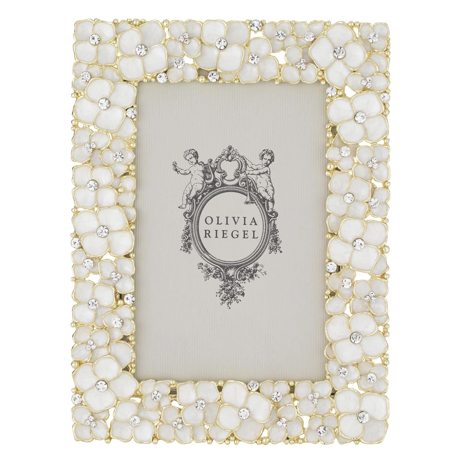 Delicate dogwood blossoms richly cast in gold finished pewter with intricate ivory hued hand-enameling and hand-set clear European crystals. Champagne hued moire silk back with easel designed for vertical or horizontal placement. Tarnish resistant. Signature luxury gift box included.