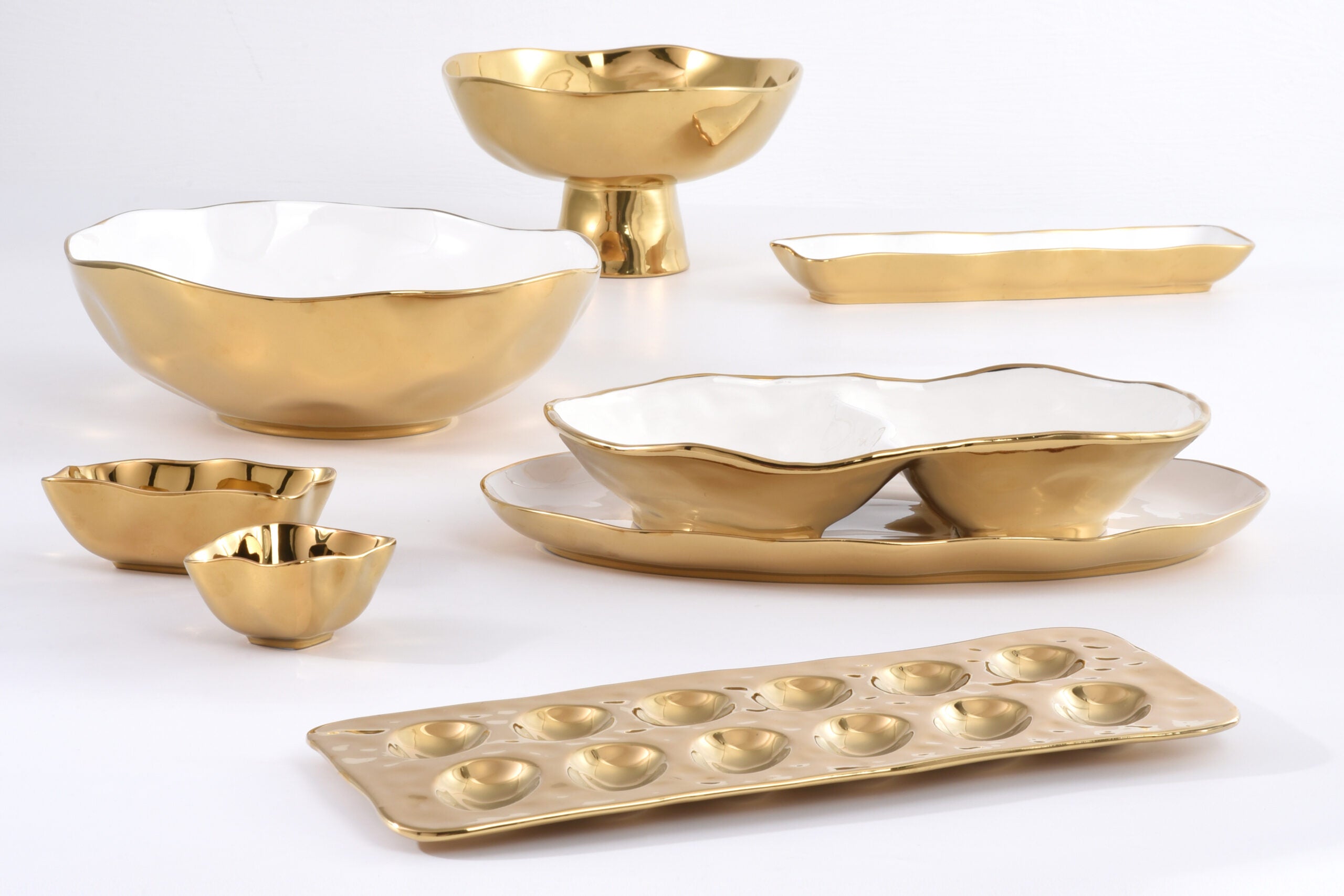 Deviled Egg Tray in Moonlight. The perfect accompaniment to relaxed weekend brunches, annual Easter celebrations or a fun night in, our egg tray is a great centerpiece for more than just eggs! Use to display a dozen deviled eggs at brunch or your beautifully decorated Easter eggs. This tray also makes for a great sushi display for a fun night in. Chill in the refrigerator first to keep food fresh and tasty when served. Striking and elegant gold-tone titanium finished high-fired porcelain. Dishwasher safe, stain resistant, tarnish free, oven safe to 500°. Tarnish and stain-free. Easy Care.