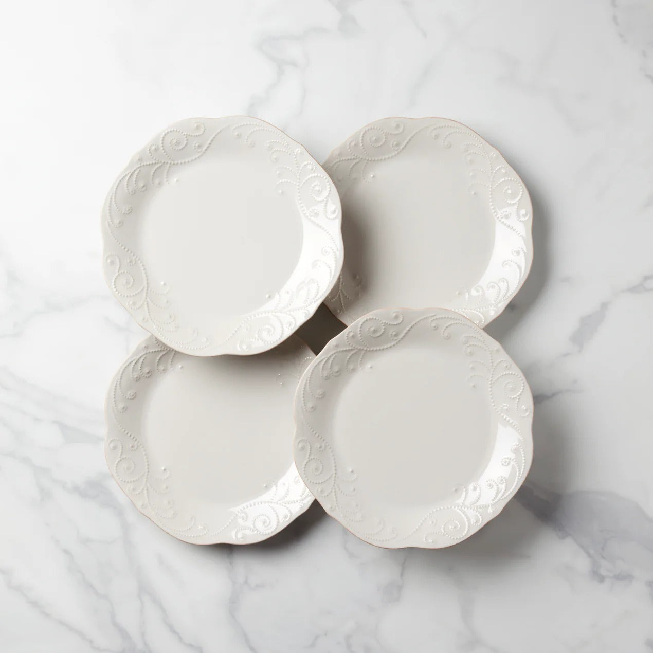 Embellished with swirls and scrolls of beads, this 4-piece dinner plate set is crafted of durable stoneware and makes a quaint addition to your dinnerware collection. The subtle curved border is accented with a hand-applied tea stain. Plus, it's microwave and dishwasher safe for added convenience.
