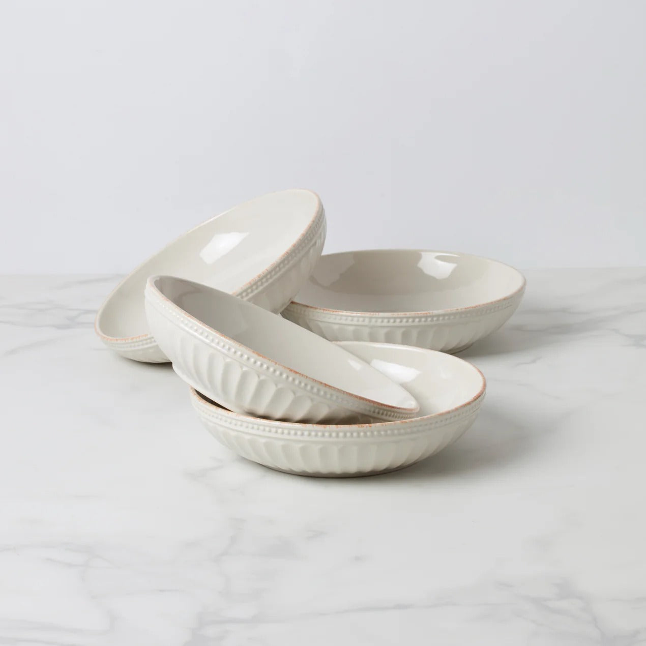 With rustic grooves and tea-stained beads, this set of four white pasta bowls coordinates perfectly with all French Perle dinnerware. Rely on it for French country-style prettiness at every meal.