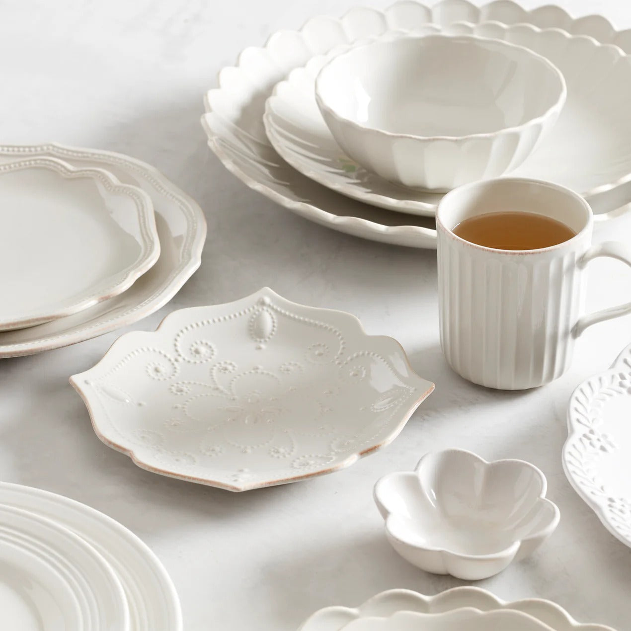 Introducing a fresh and feminine new design to celebrate the 10 year anniversary of French Perle! This 4-piece place setting is a twist on the classic country look with its clean, elegant motif, beautiful ruffles and tea-stained finish. For distinct cafe charm, mix French Perle Scallop with any of our other coordinating collections, like Classic, Groove and Bead. Bon appetit!