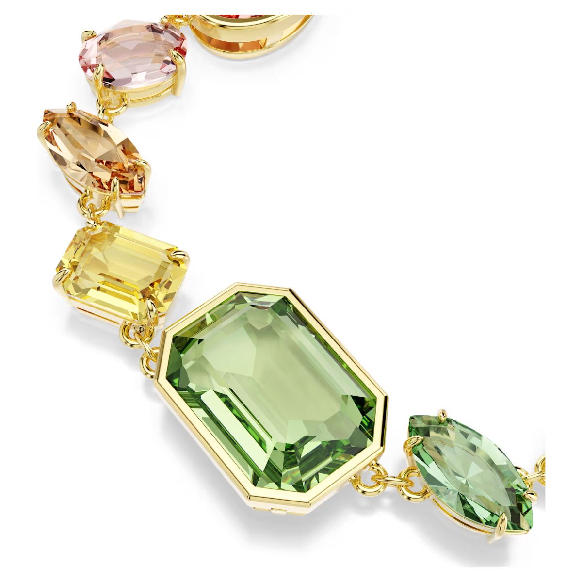 Accented with crystals of every shape and color, this gold-tone bracelet embodies the joyful and unexpected style of Swarovski’s Gema family. The design achieves a sense of intrigue through its asymmetrical arrangement, while your own personal touch can be added by adorning the bracelet in charms from our Idyllia family.