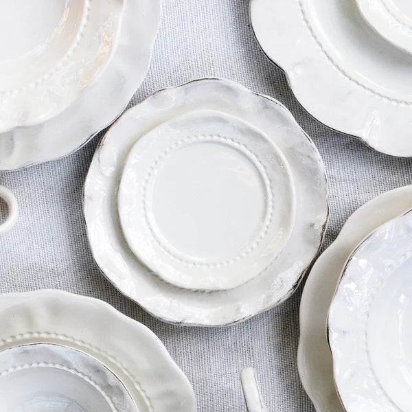 The Giorno White Salad Plate captures the essence of casually elegant Italian style, blending both relaxed and refined elements. A wreath of precise etchings encircles the plate, while the nuanced glazing adds a beautiful patina to each piece.
