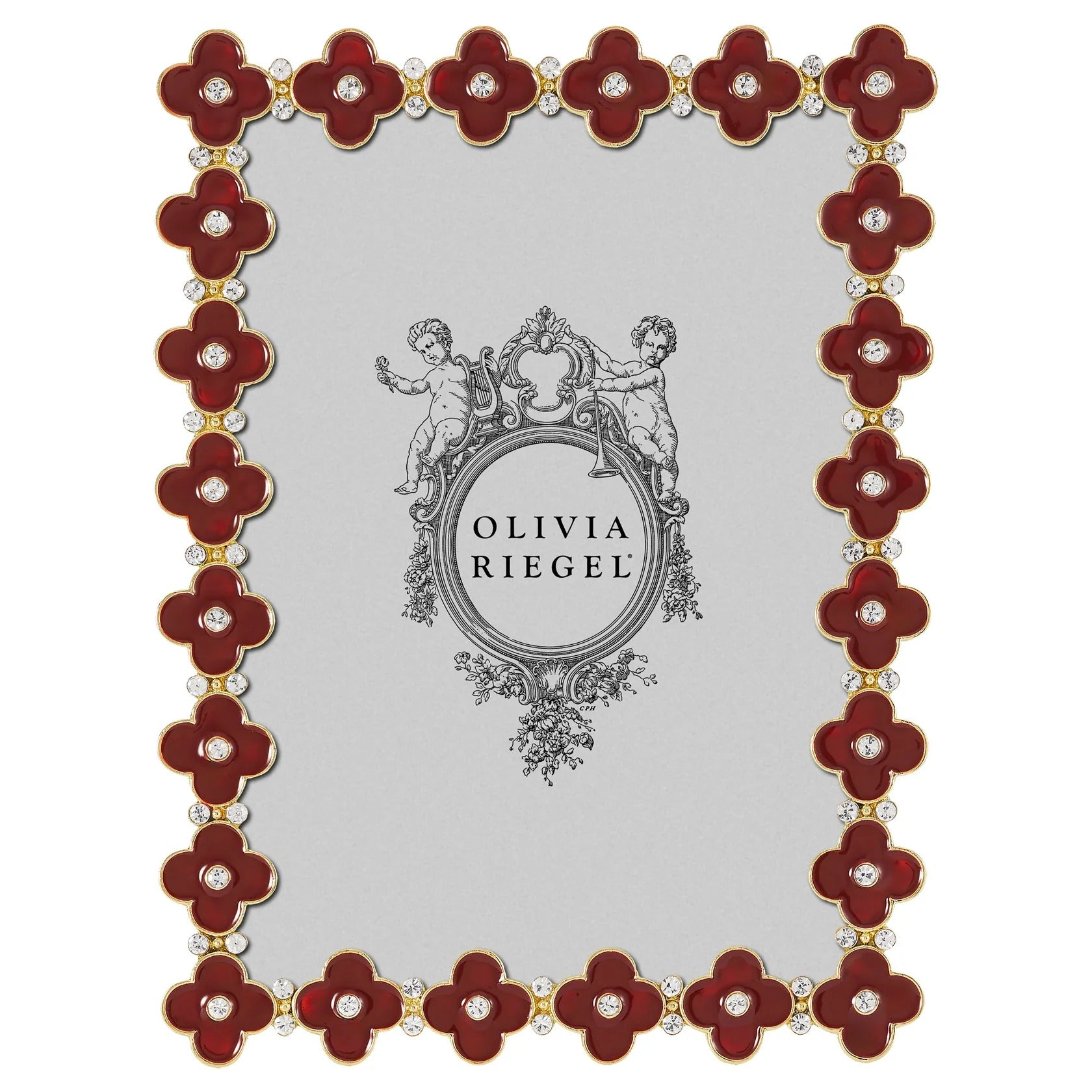 Inspired by the historic quatrefoil design—a decorative element utilized in architecture and the arts for millennia. Gold finished pewter, adorned with crimson hued hand-enameling and hand-set clear European crystals. Elegant moiré silk back, with easel designed for vertical or horizontal placement. Tarnish resistant. Signature luxury gift box included.