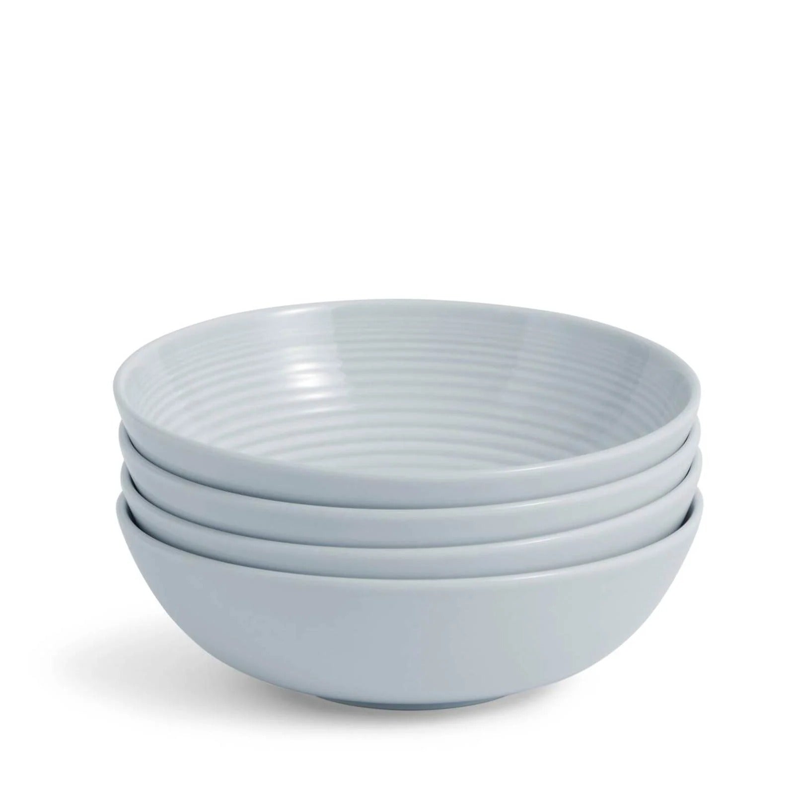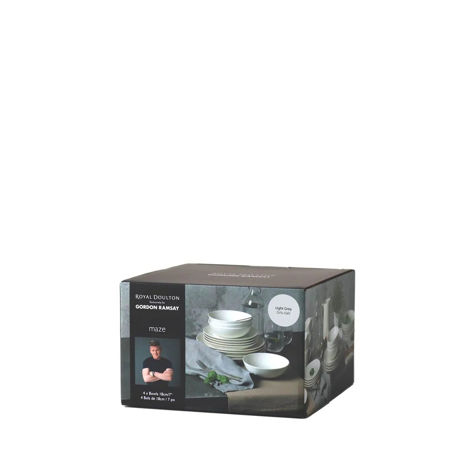 The light grey Maze dinnerware collection by Gordon Ramsay is contemporary, casual and durable enough for everyday use. This set of four 7in bowls come rendered in a subtle light grey glaze and decorated with embossed concentric circles that attract the eye towards the center of the dish; making the food the hero of the piece.