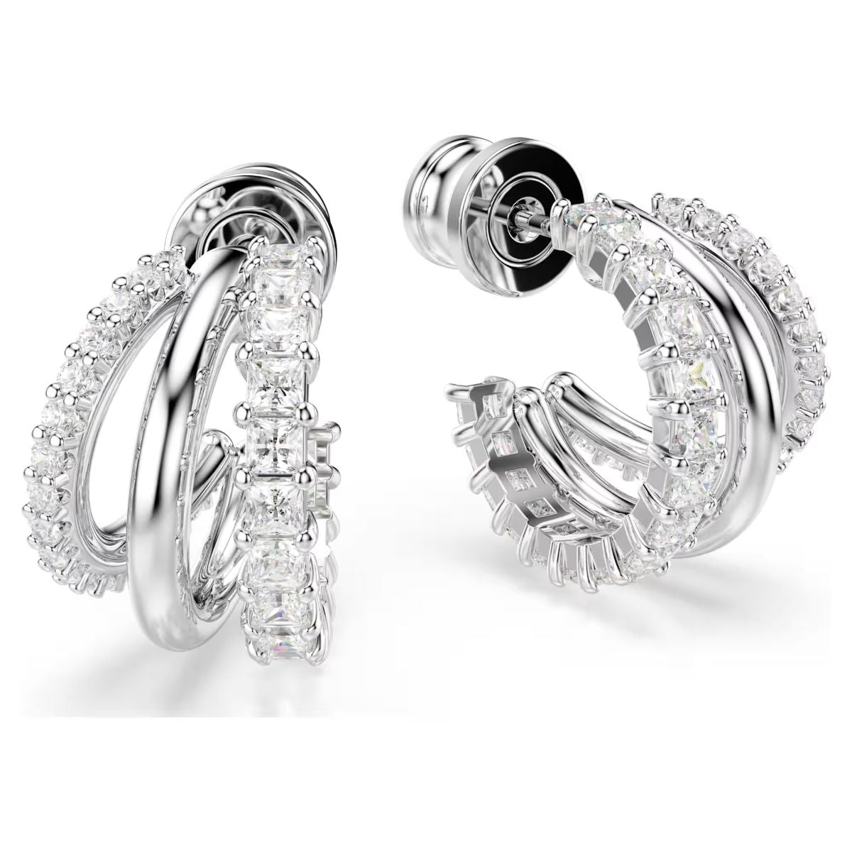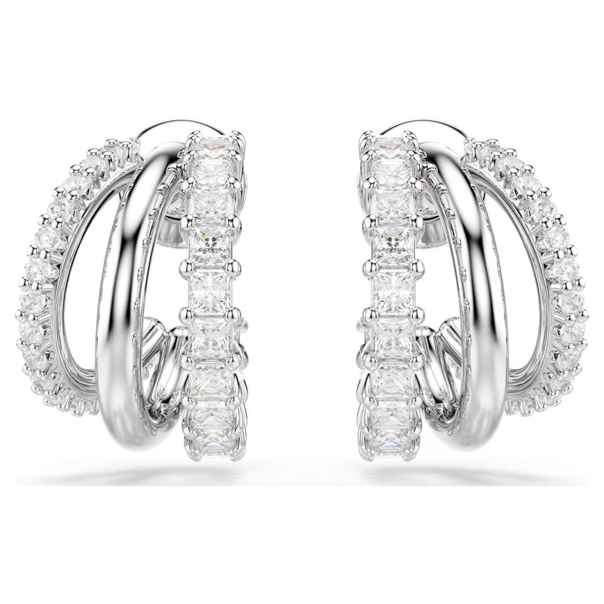 These intricately crafted Hyperbola earrings showcase a unique beauty. On each side, the three mini hoops are presented in rhodium plating, with an adornment of round and square cut Swarovski Zirconia in a prong setting. Style with a matching bangle or pendant for a showstopping look.