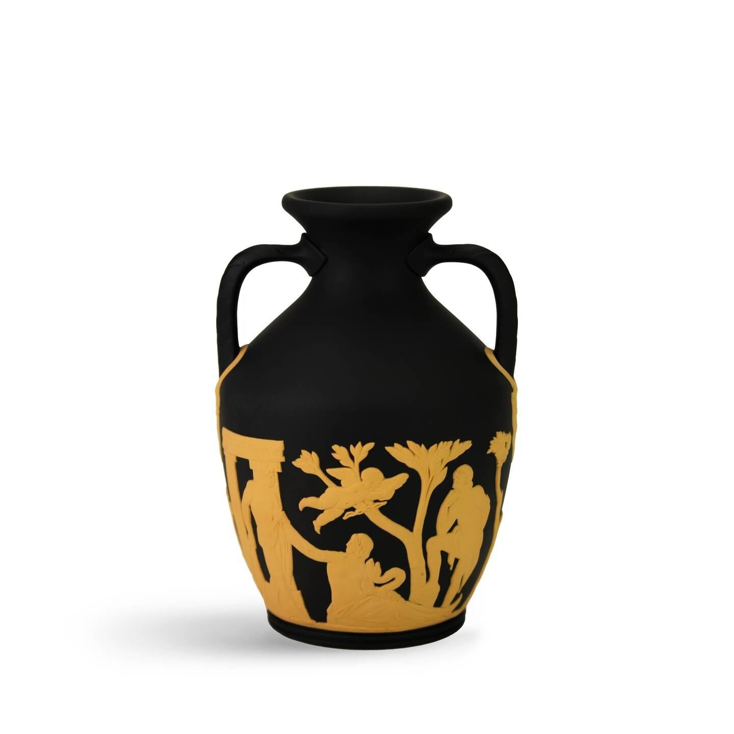 A stunning contemporary reimagining of a Wedgwood classic, this small Portland Vase is handmade in England by expert craftspeople deploying many techniques used to fabricate the original vases. The distinct look is achieved by laying cane ornamentation across beautiful black Jasper. Each piece takes nine artisans up to six hours to finish, the decorations carefully moulded and then skilfully applied by hand.