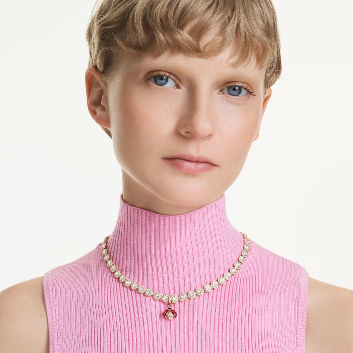 Adding a personal touch to your daily style, this playful ladybug charm is an ideal choice for those who love nature. Decorated in red and black polka-dot crystals, and with a radiant clear crystal at the center, the gold-tone plated creation features a custom-designed clasp, allowing you to wear the charm on various necklaces and bracelets.