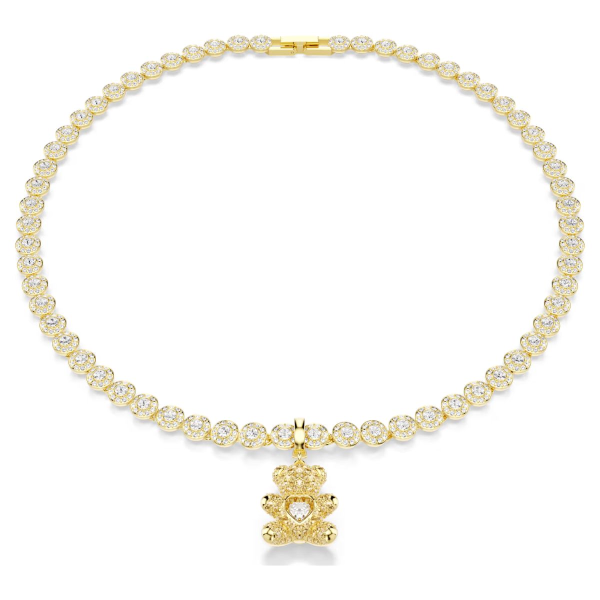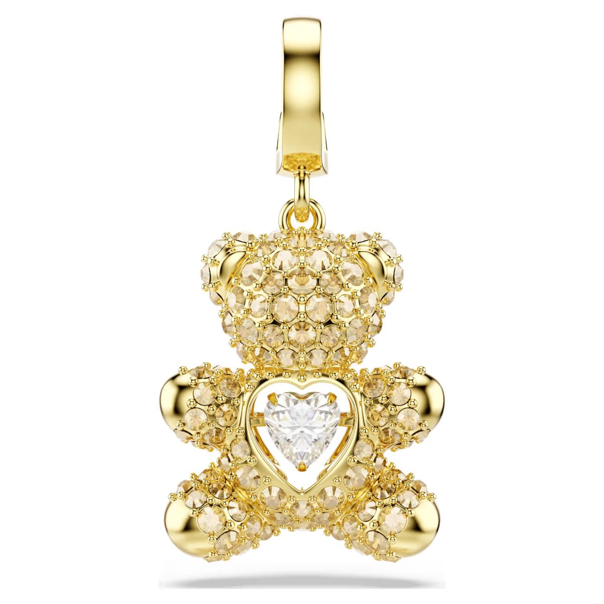 Adding a personal touch to your daily style, this gold-tone plated teddy charm is an ideal choice for those with a playful spirit. Decorated in crystals and with a radiant dancing stone at the center, the creation features a custom-designed clasp, allowing you to wear the charm on various necklaces and bracelets.