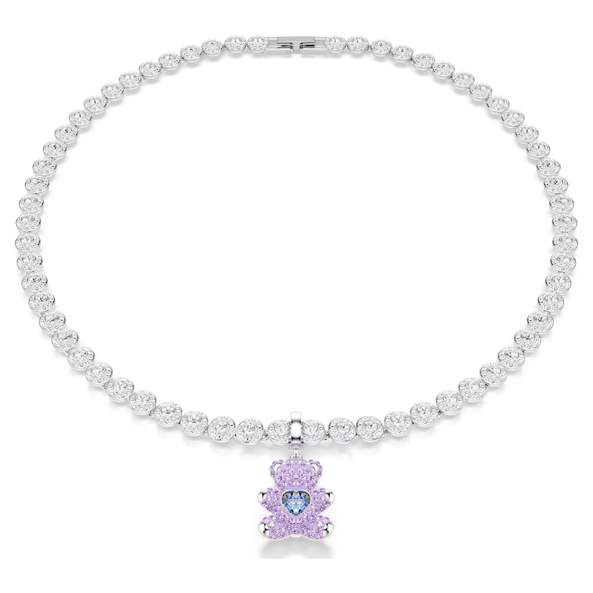 Adding a personal touch to your daily style, this rhodium plated teddy charm is an ideal choice for those with a playful spirit. Decorated in purple crystals and with a radiant blue dancing stone at the center, the creation features a custom-designed clasp, allowing you to wear the charm on various necklaces and bracelets.