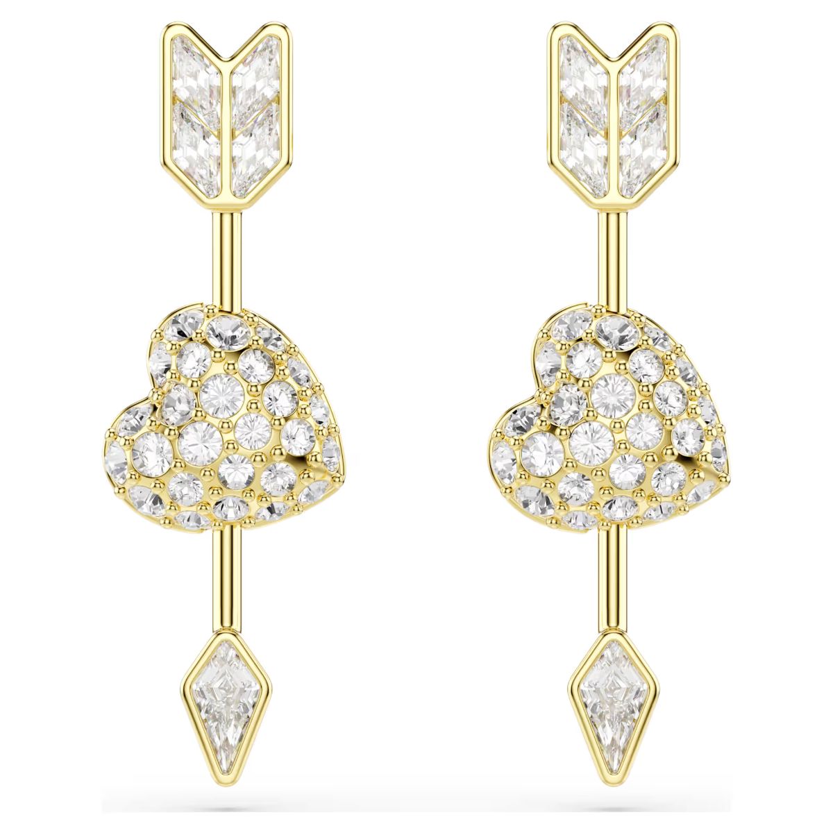 Cupid strikes twice in these expressive Idyllia earrings. Each gold-tone plated piece features a love heart pierced by an arrow, with glittering clear crystals on one side, and a vivid pink color on the other side. Reverse them as often as you like for versatile styling options.