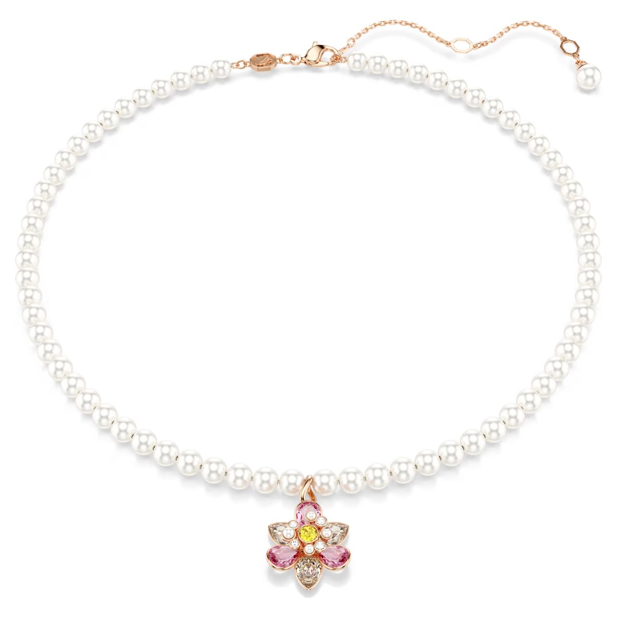 Inspired by the delicacy of nature, this all-around necklace features a full strand of Swarovski Crystal Pearls set on a rose gold-tone plated chain. At the center is a single flower, expertly crafted from crystals in various cuts and soft pastel colors. The jewelry includes a lobster closure and an extender for an adjustable fit. Wear this necklace to elevate the joy in your everyday style and pair it with matching pieces from the same family for a coordinated look.