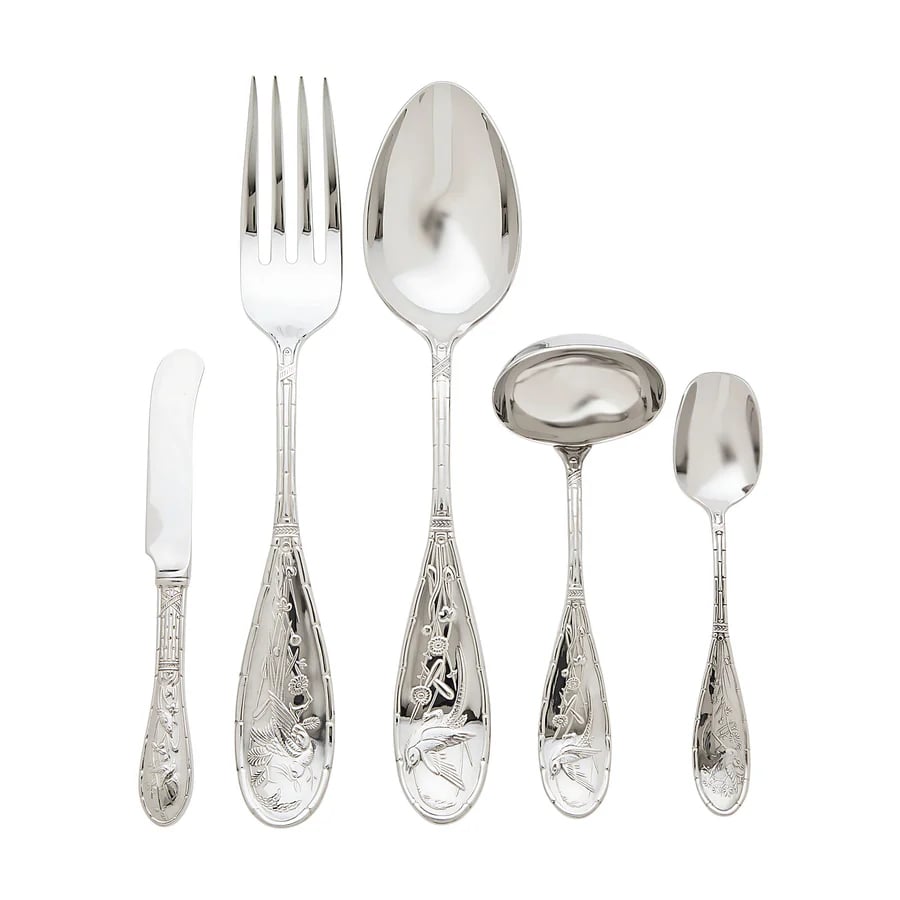 Celebrate the beauty of nature with Ricci Silversmiths' Japanese Bird flatware, where artistry and elegance intertwine. Each piece in this collection is uniquely adorned with delicate bird and flower motifs, surrounded by a bamboo-inspired border that echoes the serene beauty of Japanese landscapes.