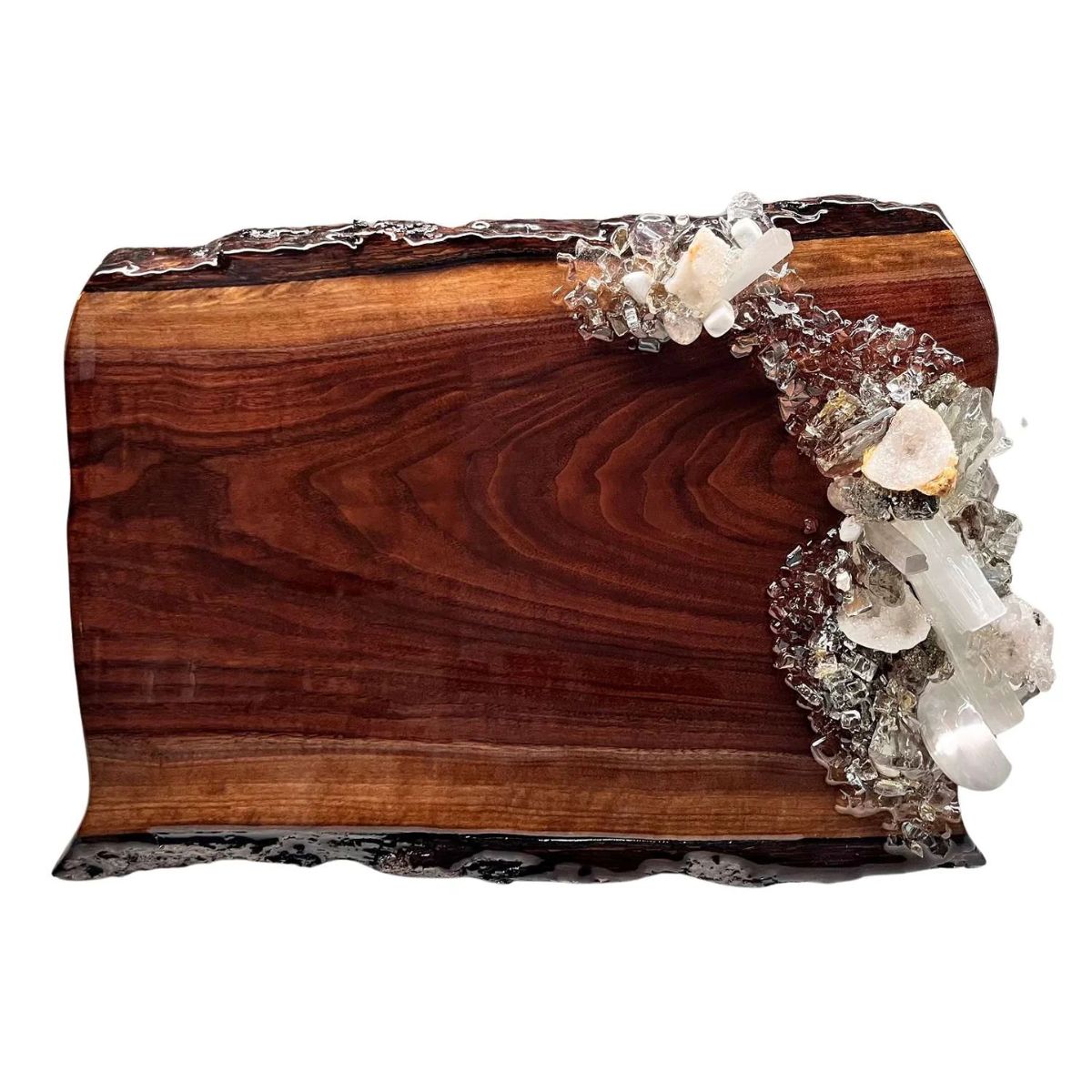 The Krystallos pattern's clear and white adornment includes a selection of glass and natural minerals, such as, selenite, calcite, and quartz. The underside is hand-signed and branded by the artists. Dust bag included