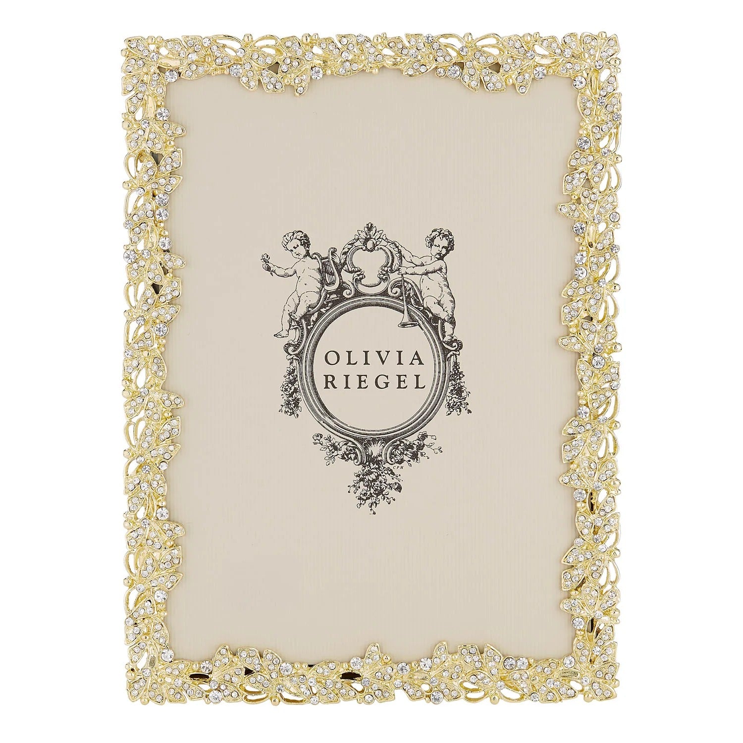 Gold finished pewter, encrusted with hand-set clear European crystals. Elegant champagne hued moiré silk back, with easel designed for vertical or horizontal placement. Tarnish resistant. Signature luxury gift box included.