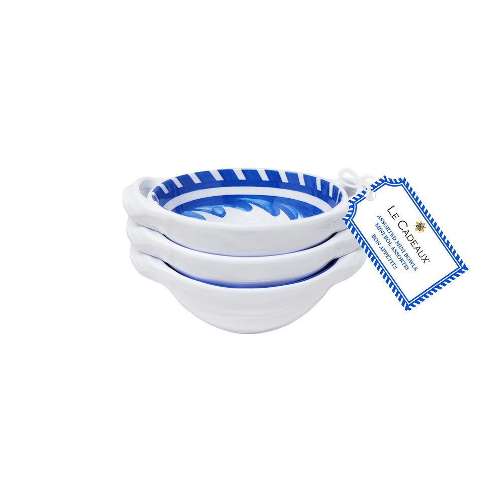 Super fun and cute, sold in a set of three tied with bow and tag for effortless gift-giving! So versatile and so many uses; food prep bowls, small side bowls for each place setting, cocktail party nuts, olives, hummus and other dips. BPA free 100% melamine, shatter resistant and dishwasher safe, top and bottom rack, as with all melamine, not recommended for microwave.