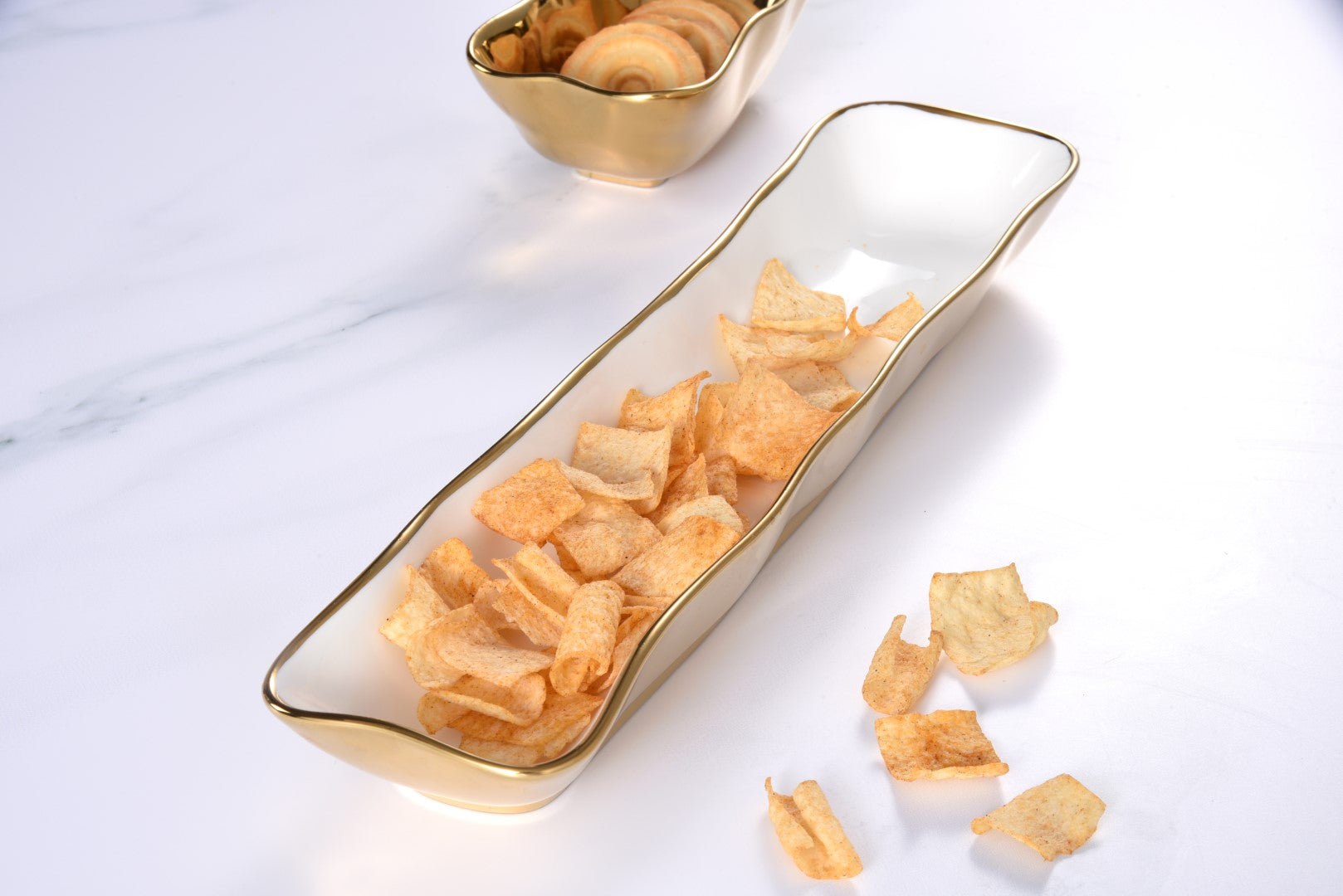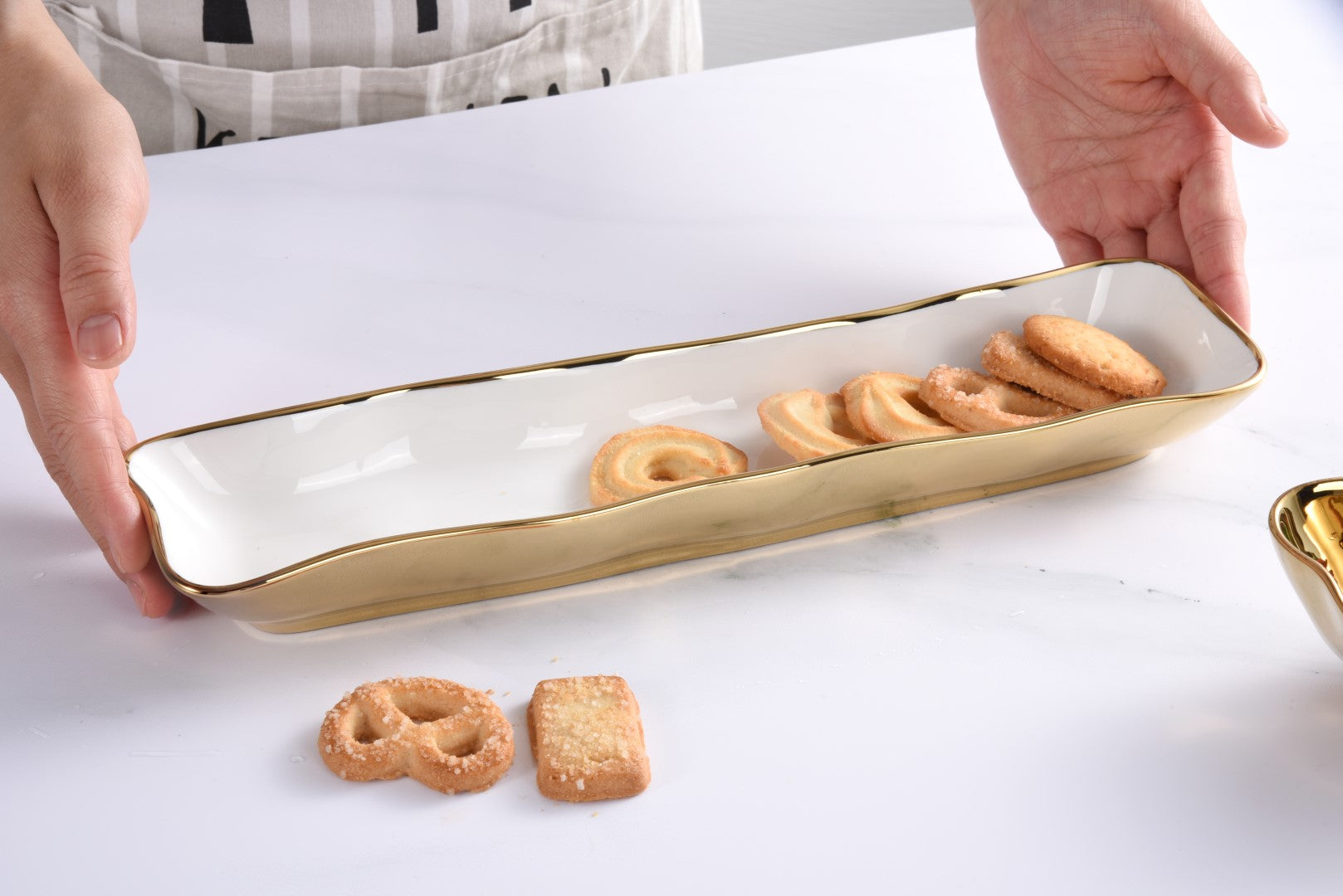Cracker Tray in Moonlight. Perfect for crackers, small cookies, and other small treats. Crafted in a stunning white high-fired porcelain with gold titanium. Food safe, dishwasher safe, oven safe to 500°. Easy Care.