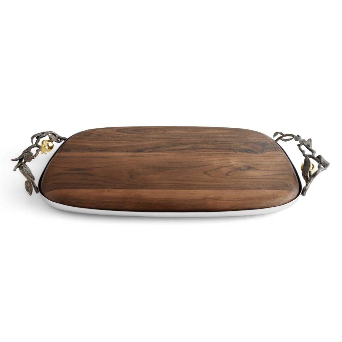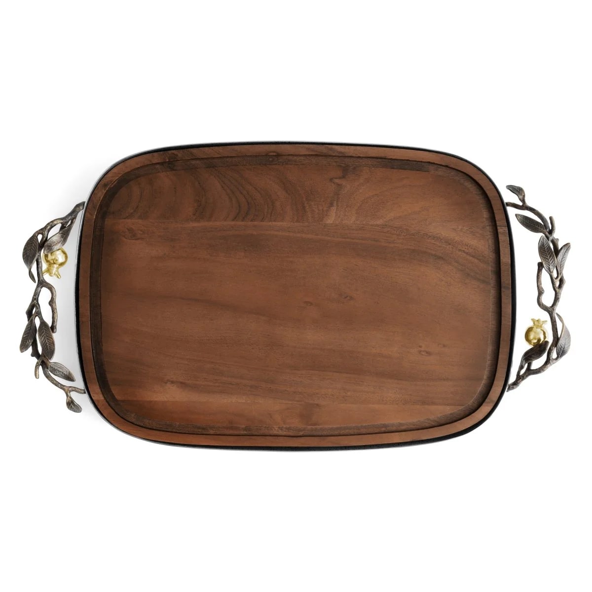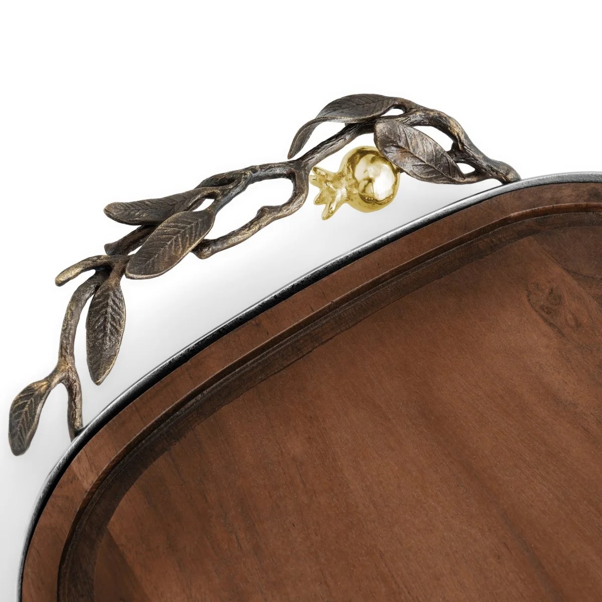 The Pomegranate Bread Board is a luxurious fusion of natural beauty and symbolic meaning, handcrafted in rich wood with sculpted pomegranate accents in oxidized brass and 24K goldplate. Celebrating life, renewal, and abundance, each piece reflects Michael Aram’s deep personal connection to this ancient fruit. Elegant and artisanal, it transforms everyday moments into rituals of beauty and significance.