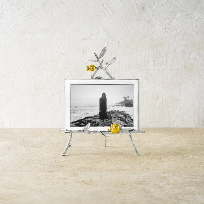 Celebrate cherished memories with the Pomegranate Easel Frame, where handcrafted silver and gold tones evoke warmth, tradition, and timeless luxury. Inspired by the nostalgic beauty of a beloved fruit, each detail reflects artistry rooted in culture, sentiment, and elegance.