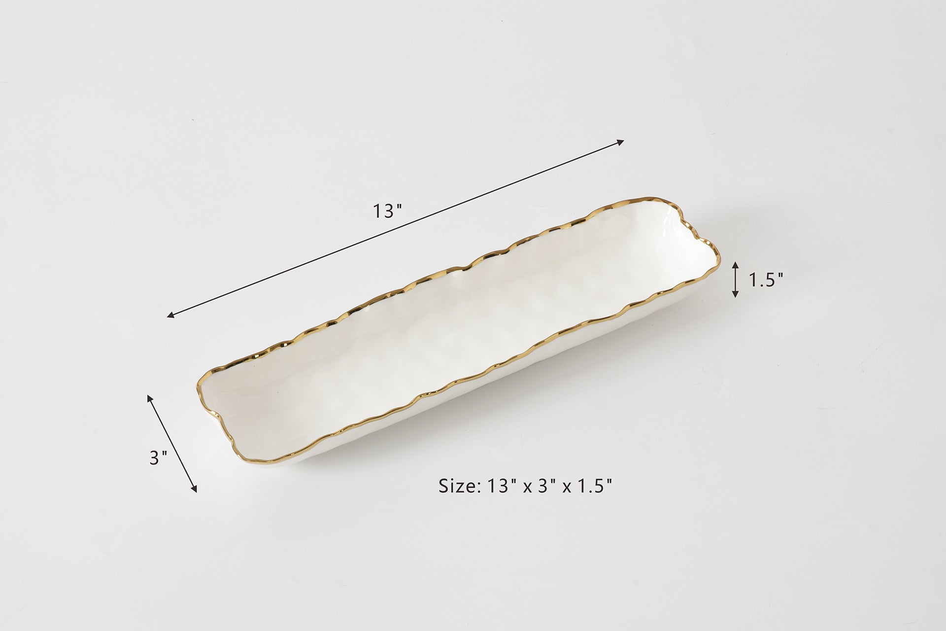 Cracker Tray in our Portofino Collection. Perfect for crackers, small cookies and other small treats. Gorgeous white porcelain with a delicate gold trim. Food safe, tarnish free, dishwasher safe, oven safe to 500°. Easy Care.