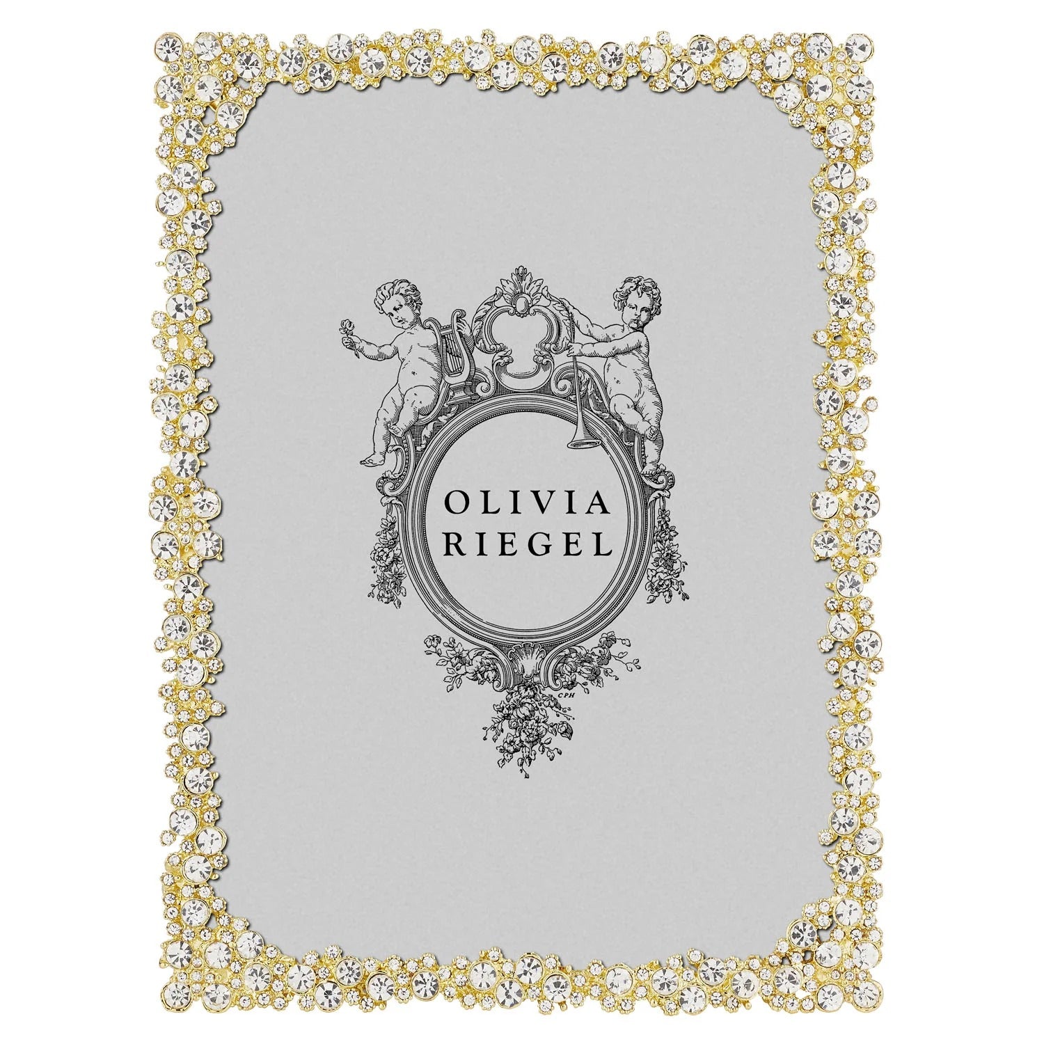 Stunning clusters of hundreds of hand-set clear European crystals in gold finished cast pewter. Elegant blue moiré silk back with easel for vertical or horizontal placement. Tarnish resistant. Signature luxury gift box included.