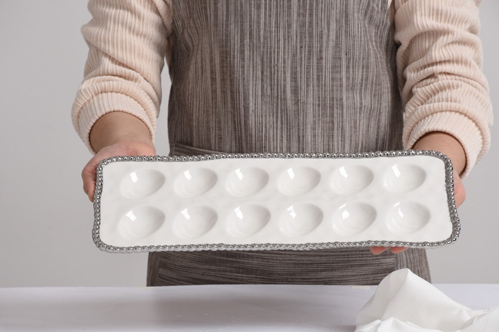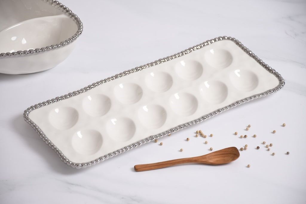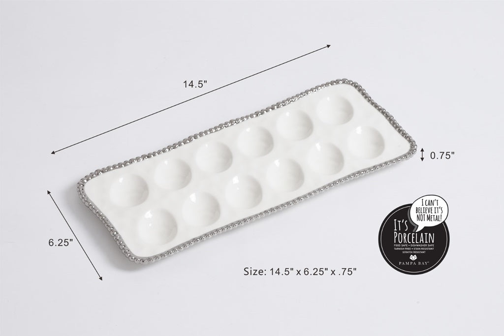 Deviled Egg Tray in Salerno. The perfect accompaniment to relaxed weekend brunches, annual Easter celebrations or a fun night in, our Egg Tray is a great centerpiece for more than just eggs! Use to display a dozen deviled eggs at brunch or your beautifully decorated Easter eggs. This tray also makes for a great sushi display for a fun night in. Chill in the refrigerator first to keep food fresh and tasty when served. Gleaming white porcelain with lustrous silver beads in a titanium finish. Food safe, dishwasher safe, oven safe, Tarnish and stain-free. Easy Care.