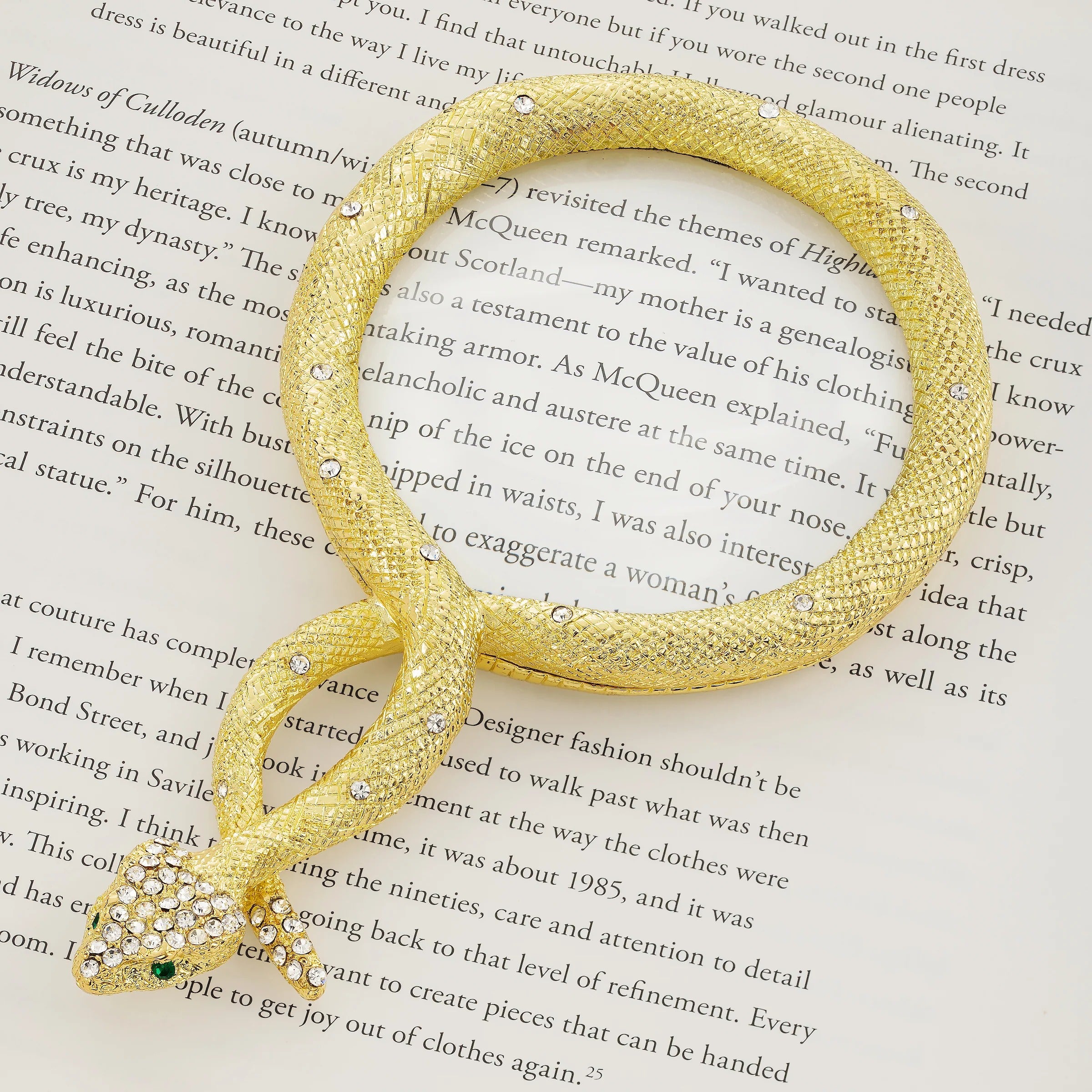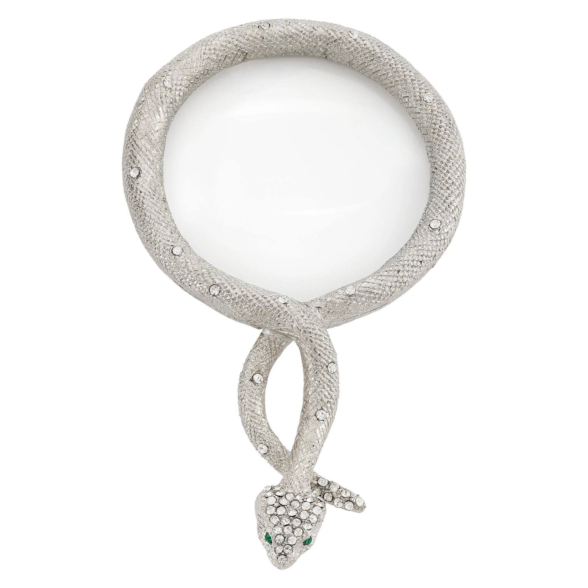 Celebrate the wisdom and mystery of the 2025 year of the snake with this chic gold finished pewter serpent patterned magnifying glass. Encrusted with hand-set clear pavé European crystals and emerald green crystal eyes. This magnifying glass offers 2x magnification. Tarnish resistant. Signature luxury gift box included.