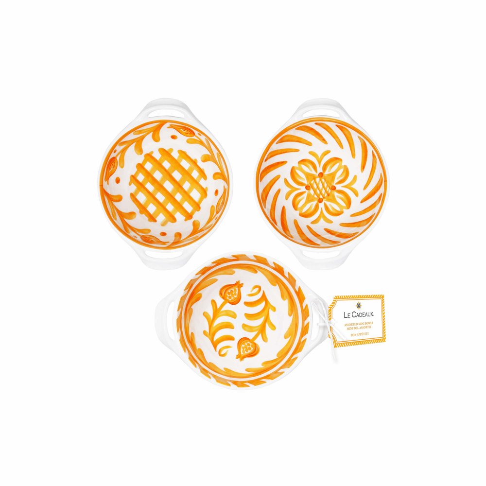 Super fun and cute, sold in a set of three tied with bow and tag for effortless gift-giving! So versatile and so many uses; food prep bowls, small side bowls for each place setting, cocktail party nuts, olives, hummus and other dips. BPA free 100% melamine, shatter resistant and dishwasher safe, top and bottom rack, as with all melamine, not recommended for microwave.