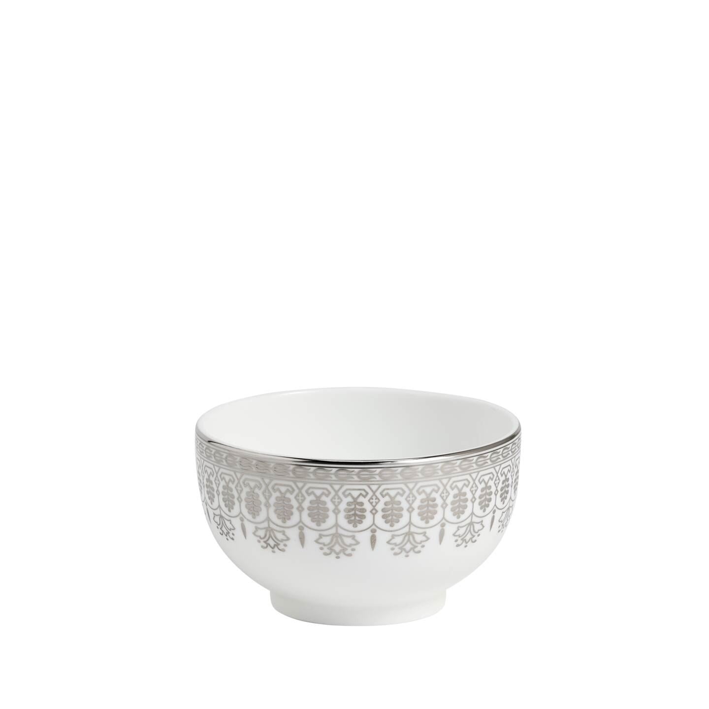 Complete your table setting with the Silver Tonquin Bowl. Crafted from fine bone china, this elegant piece features intricate platinum detailing that adds a touch of sophistication to any meal. Perfect for both casual and formal dining, it combines classic beauty with modern elegance.