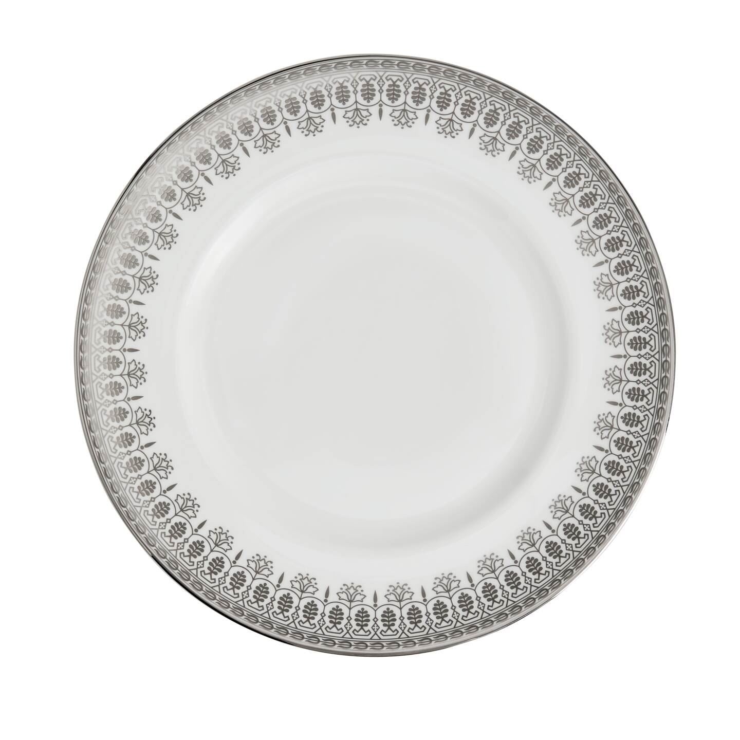 Add a touch of luxury to your dining table with the Silver Tonquin Plate. This beautiful piece, crafted from strong fine bone china, features subtle platinum embellishments that enhance its sophisticated appeal. Ideal for both everyday use and special occasions, it exudes elegance and style.